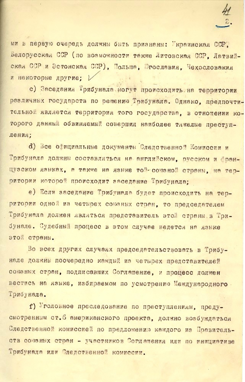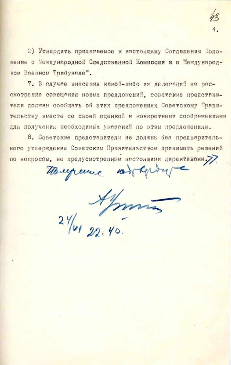 Наши делегаты получили жесткие инструкции из Кремля. Об этом нам поведал рассекреченный проект директивы «Советским представителям при переговорах в Лондоне по поводу соглашения о наказании главных военных преступников», направленный А.Я. Вышинским на подпись И.В. Сталину