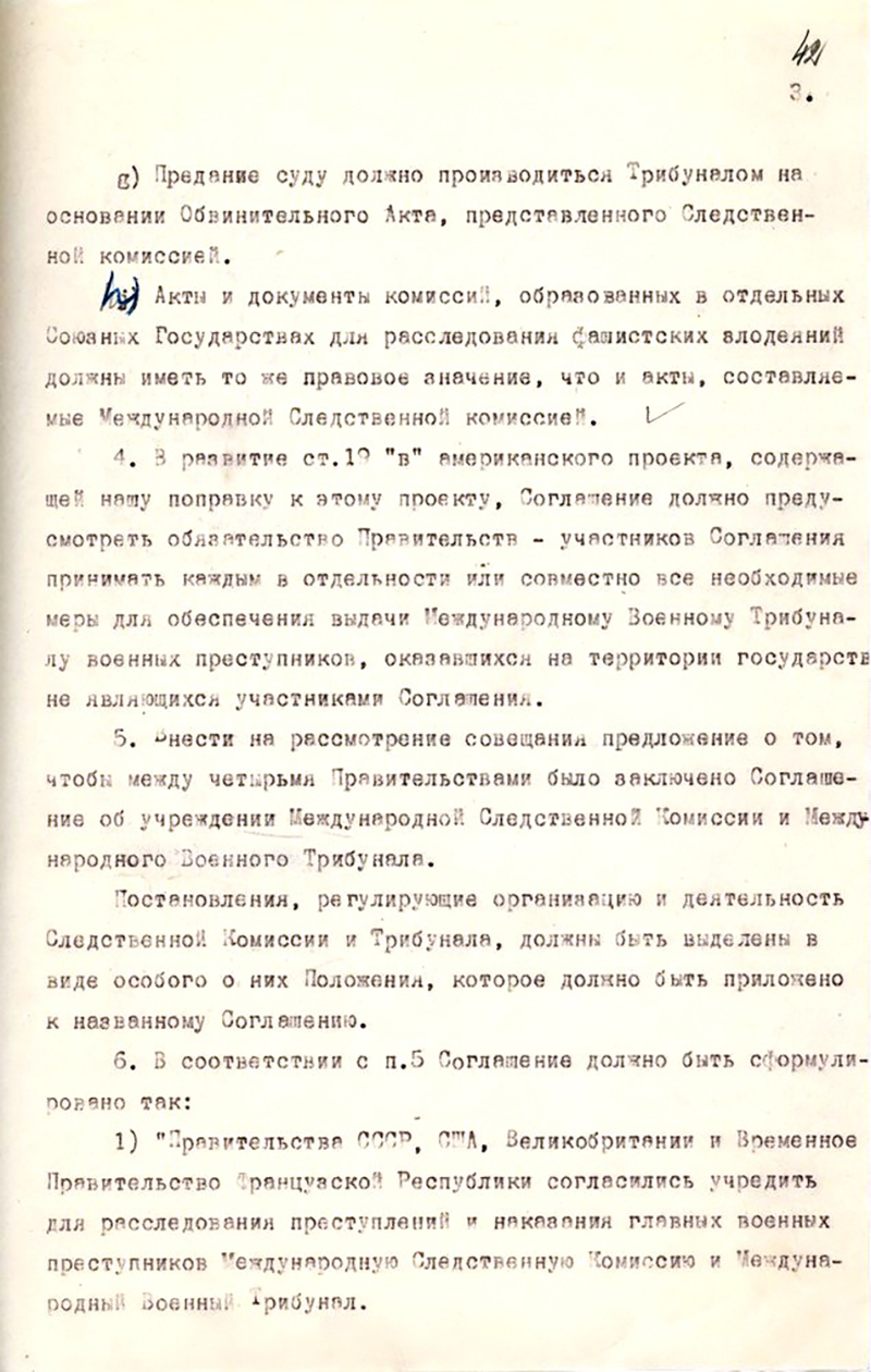 24 июня 1945 года. В документе, в частности, предписывалось возражать против предания суду нацистских организаций (поскольку они и так уже были объявлены преступными по итогам Крымской конференции и были уже распущены после капитуляции Германии). Требовалось также отстаивать пункт об экстрадиции преступников из нейтральных стран, и еще целый ряд других существенных положений (Архив внешней политики Российской Федерации. Ф. 07. Оп. 13. П. 41. Д. 2. Л. 40–43).