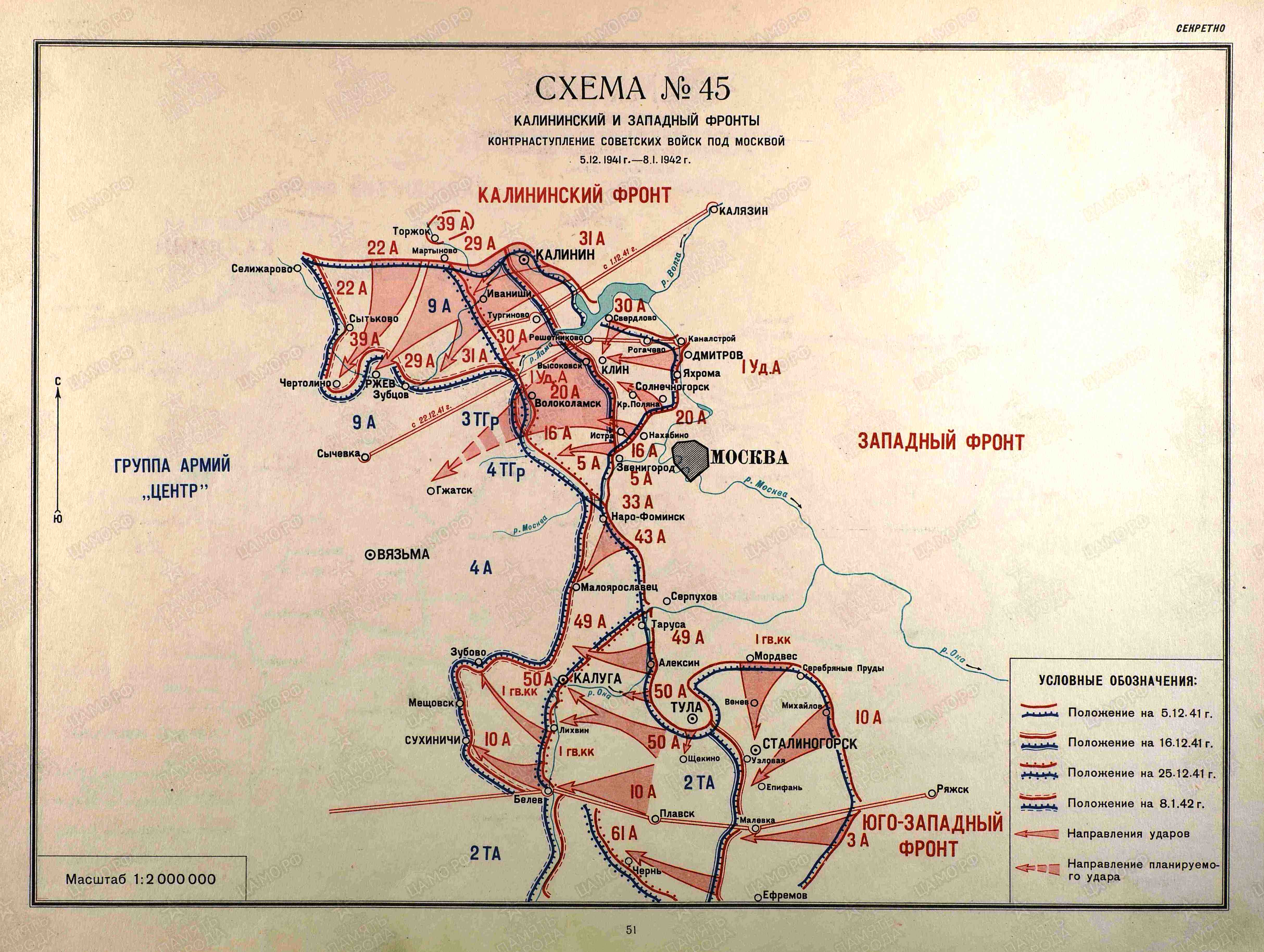 5 декабря 1941г войска Калининского фронта под командованием генерал-полковника Конева перешли в контрнаступление. 6 декабря 1941г к операции подключились силы Западного (генерал армии Г.К. Жуков) и Юго-Западного (маршал С.К. Тимошенко) фронтов. К концу первой недели декабря 1941г советское наступление развернулось на калининском, клинском, солнечногорском, истринском, тульском и елецком направлениях.