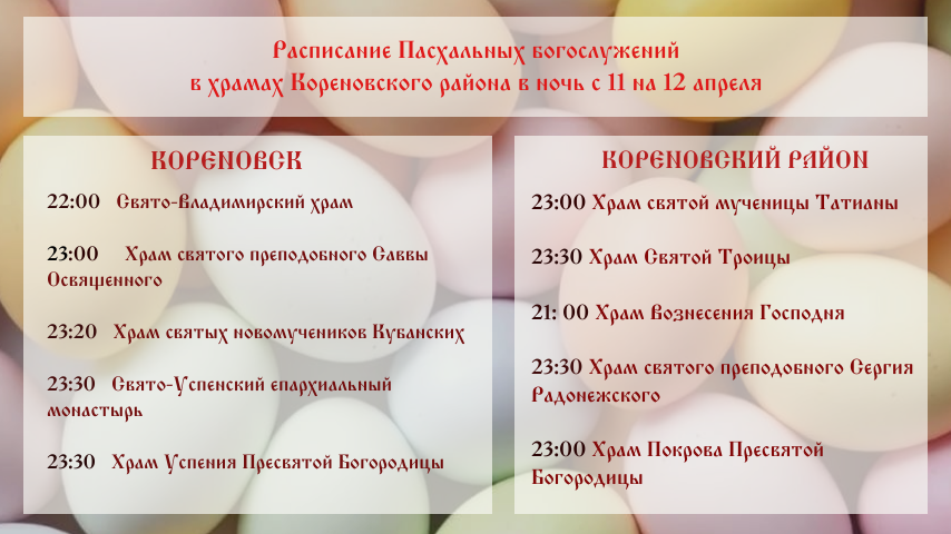 Расписание праздничных богослужений в храмах Кореновского района в ночь с 11 на 12 апреля