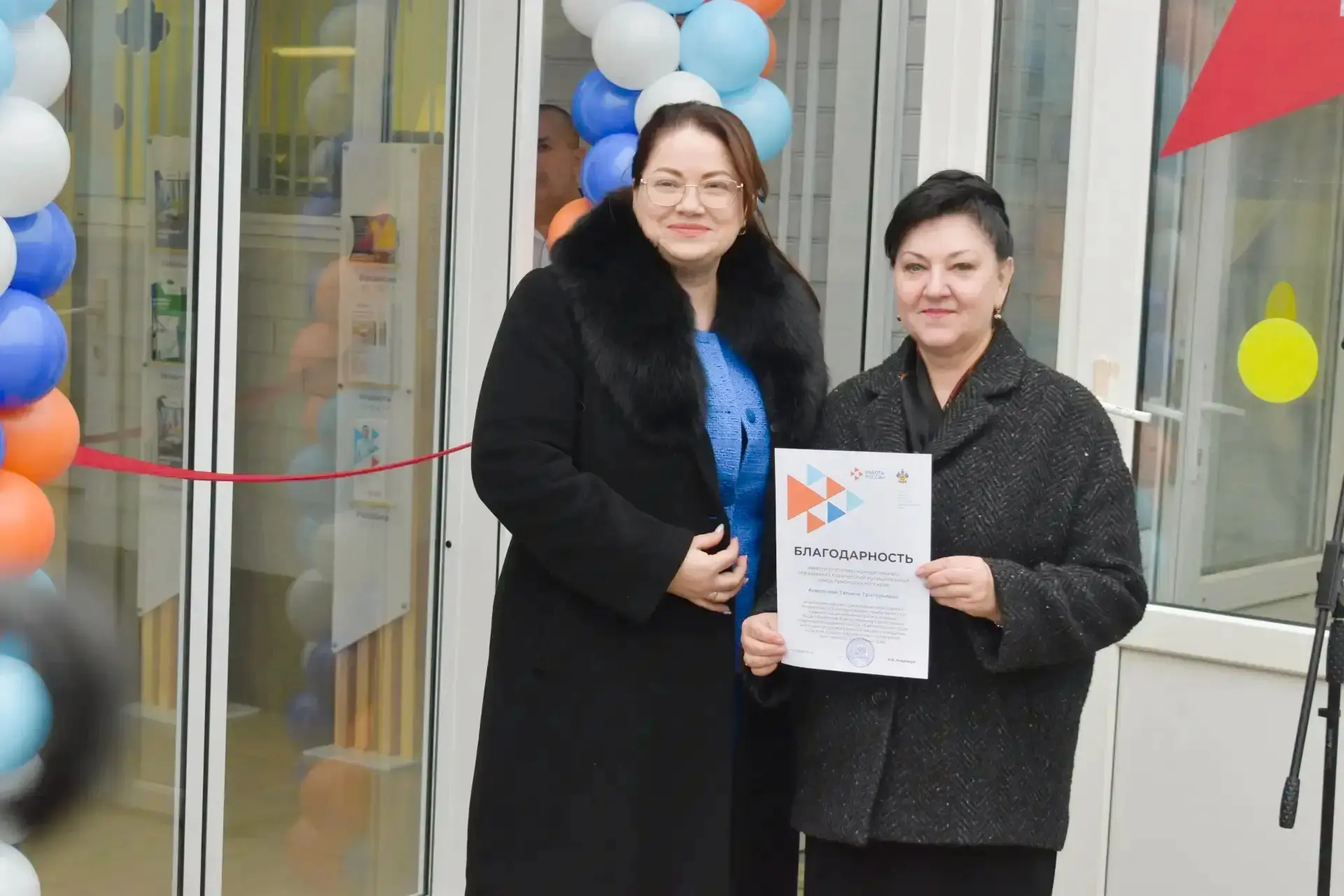 После выступления почетных гостей, вручения благодарственных писем ГКУ КК «Центра занятости населения Краснодарского края» и музыкального номера была разрезана красная лента и филиал распахнул свои двери для жителей Кореновского района.