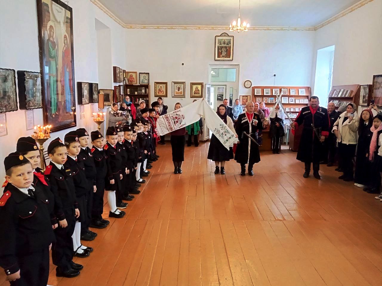 Торжество проводилось субботним утром в станичном храме при большом стечении родных и близких юных казачат. Настоятель прихода святого преподобного Сергия Радонежского иерей Александр (Калабухов) отслужил праздничный молебен и совершил обряд водосвятия по православному воинскому чину, после чего благословил детей и взрослых на благие деяния.