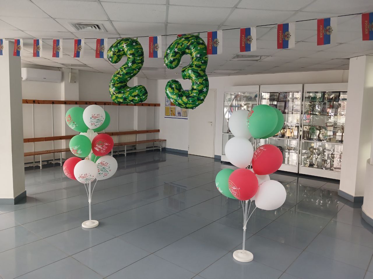 Всех гостей встречал украшенный по тематике холл, а у входа развевались государственные флаги. Рядом у стен спорткомплекса для всех желающих расположилась полевая солдатская кухня: здесь вкуснейшая горячая гречка с тушенкой, чай и сладости. Военный рацион может отведать любой кореновец.