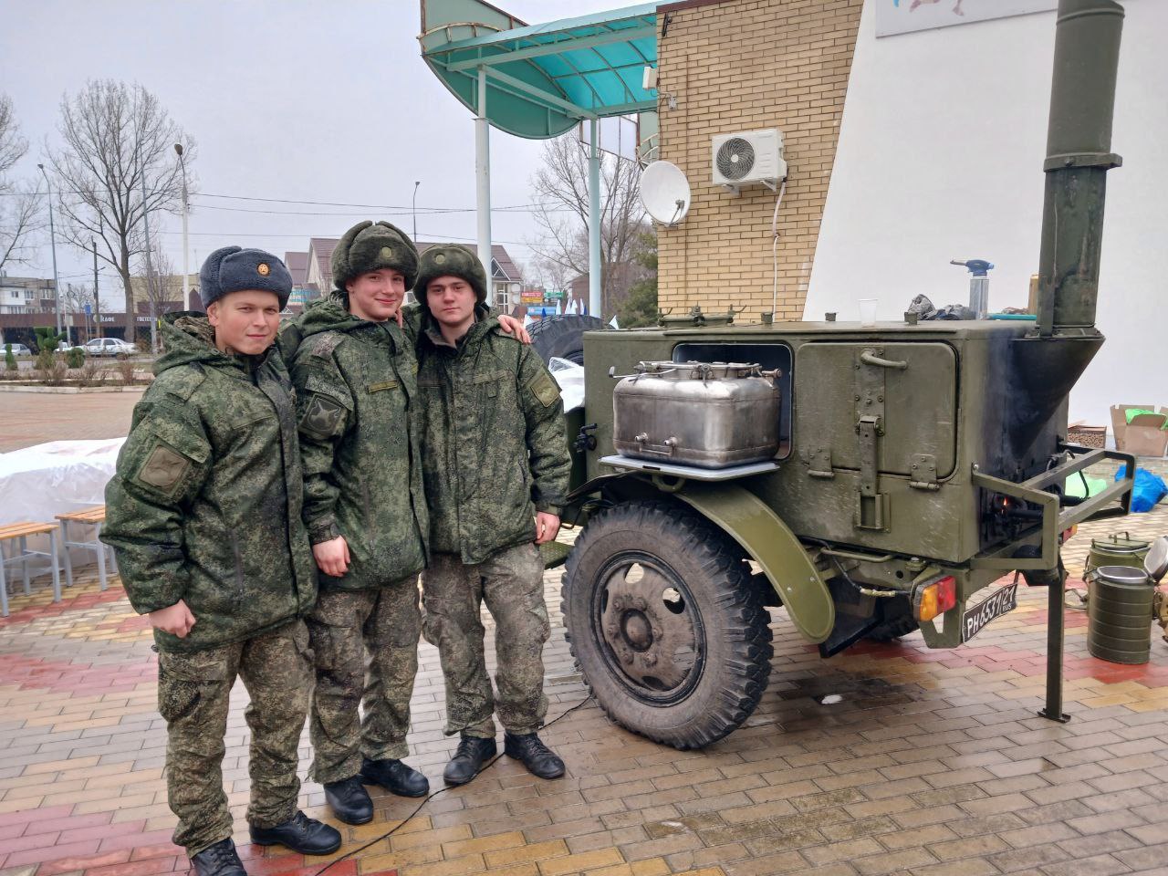 Военнослужащие 47 бригады роты материально-технического обеспечения, ответственные за раздачу, встречают гостей улыбками и поздравлениями.