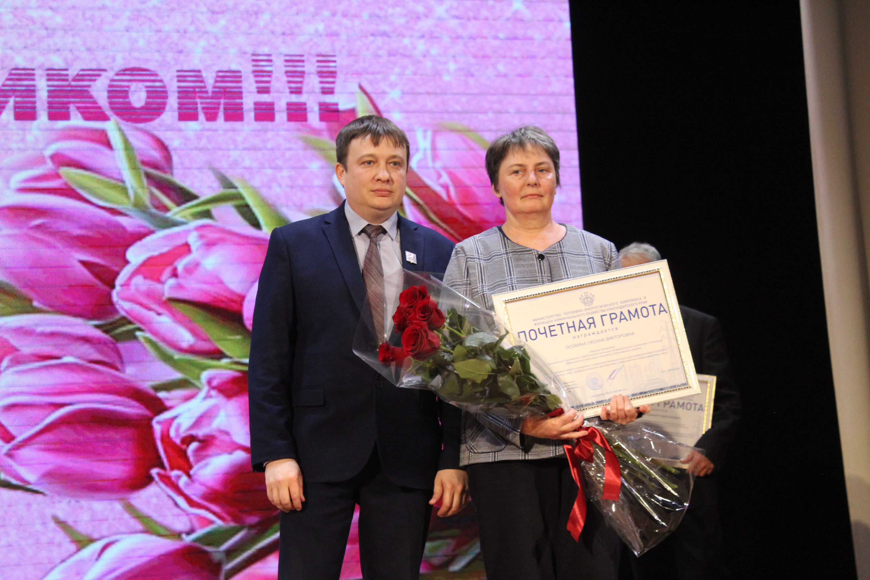 Почётной грамотой Министерства топливно-энергетического комплекса награждены: Владимир Красников - инженер контрольно-измерительных приборов и автоматики водоцеха муниципального унитарного предприятия «ЖКХ» Кореновского городского поселения, Оксана Осокина - главный бухгалтер МУП ЖКХ «Станица» Дядьковского сельского поселения, Александр Першин – механизатор МБУ «Услуга» Братковского сельского поселения, Александр Хохуцкий – директор МУП «ЖКХ» Сергиевского сельского поселения, Геннадий Червяк - директор МУП «ЖКХ» Журавского сельского поселения.