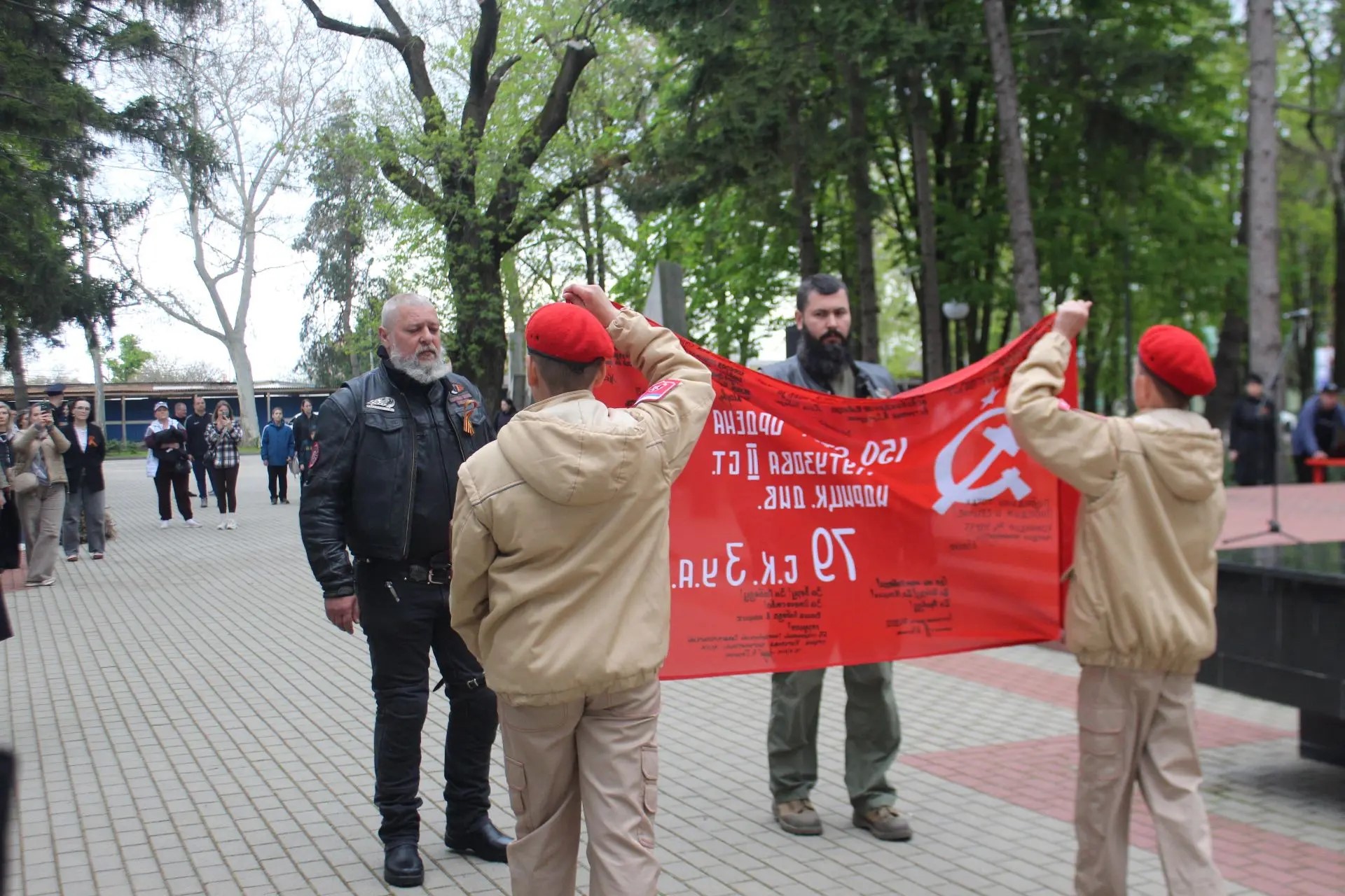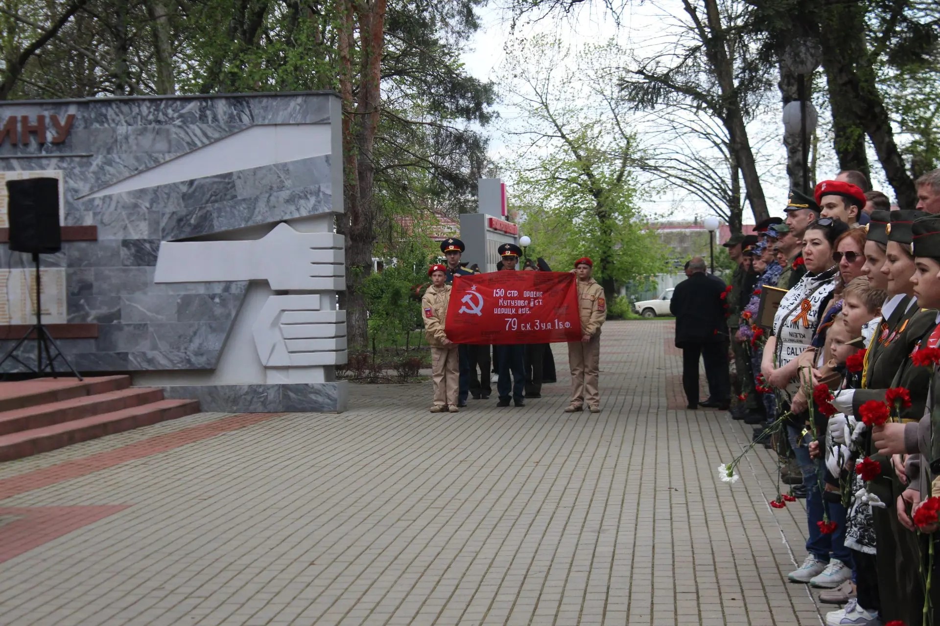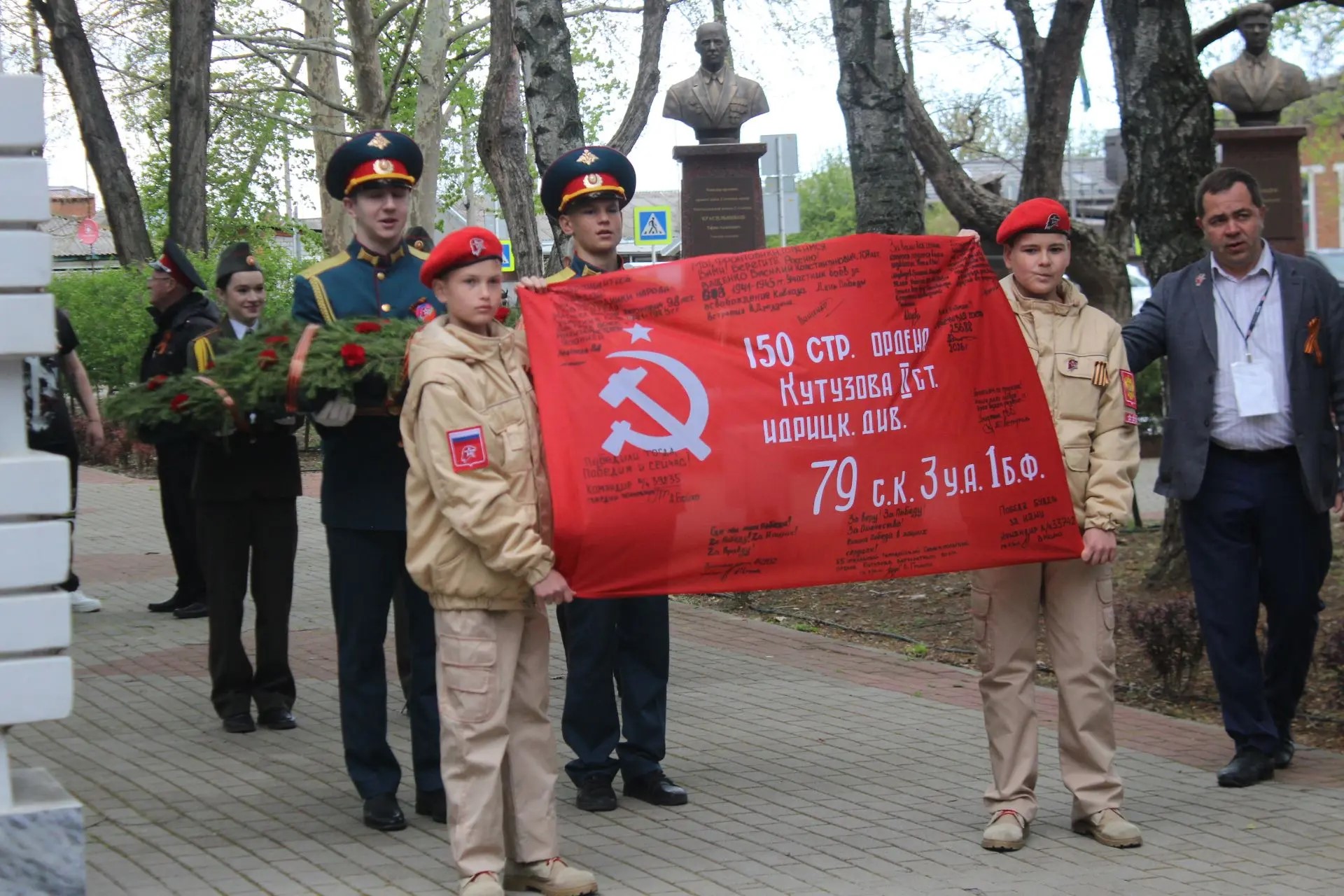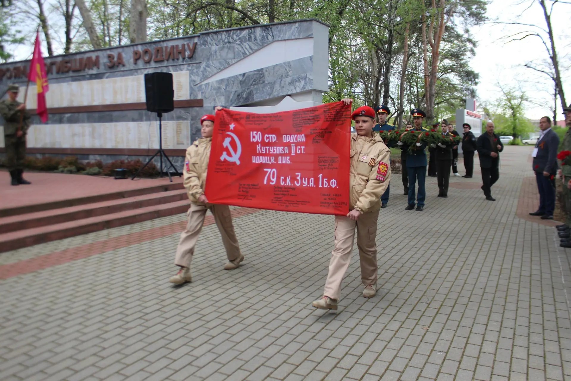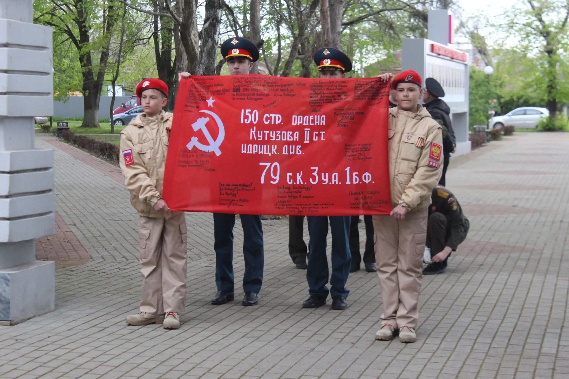 Почетное право передать копию Знамени было предоставлено юнармейцам из школы №1 им. И.Д. Бувальцева. Этот жест стал живым символом преемственности: от тех, кто сражался за Родину в сороковые, через тех, кто защищает её сегодня, - к новому поколению патриотов.