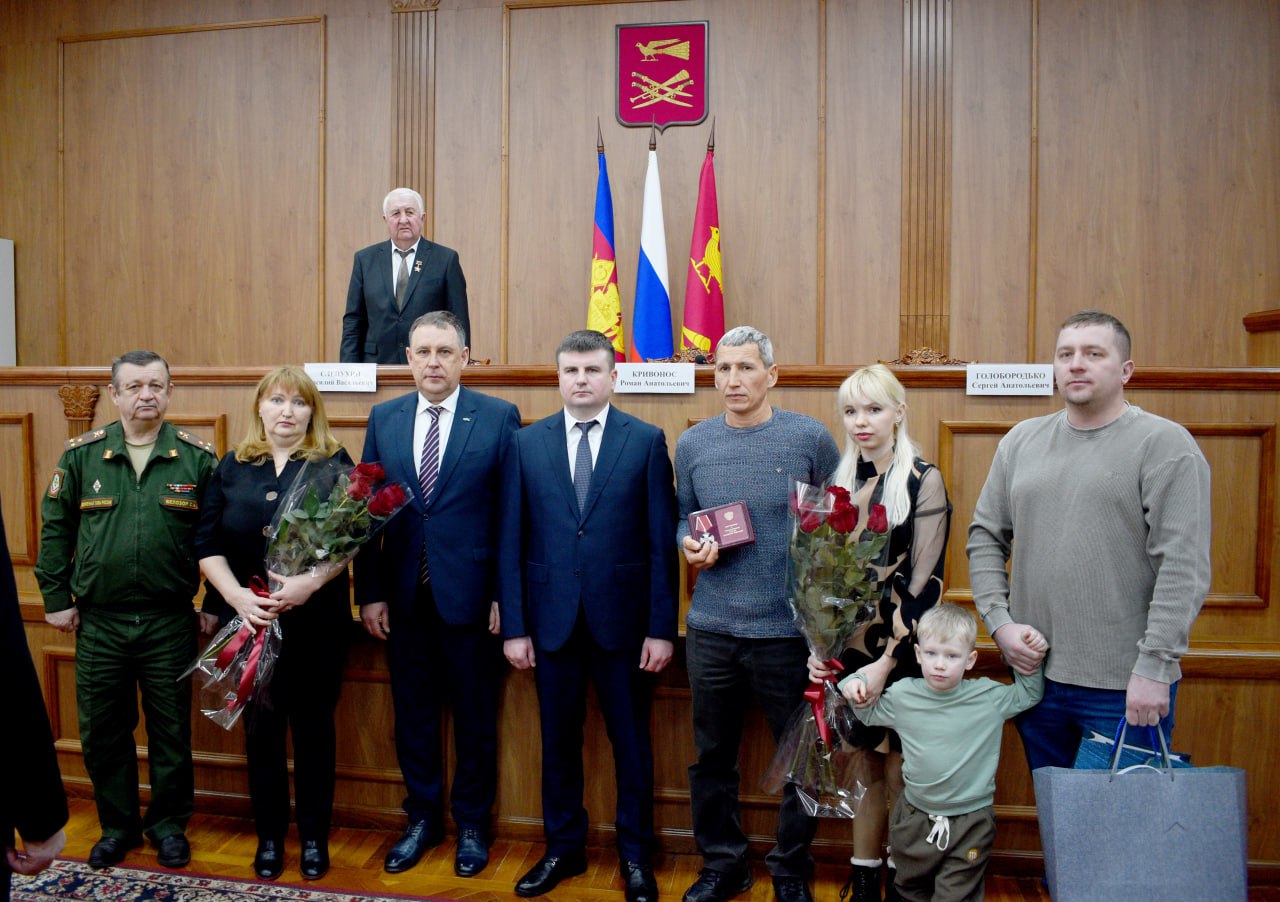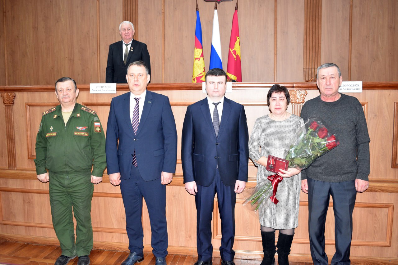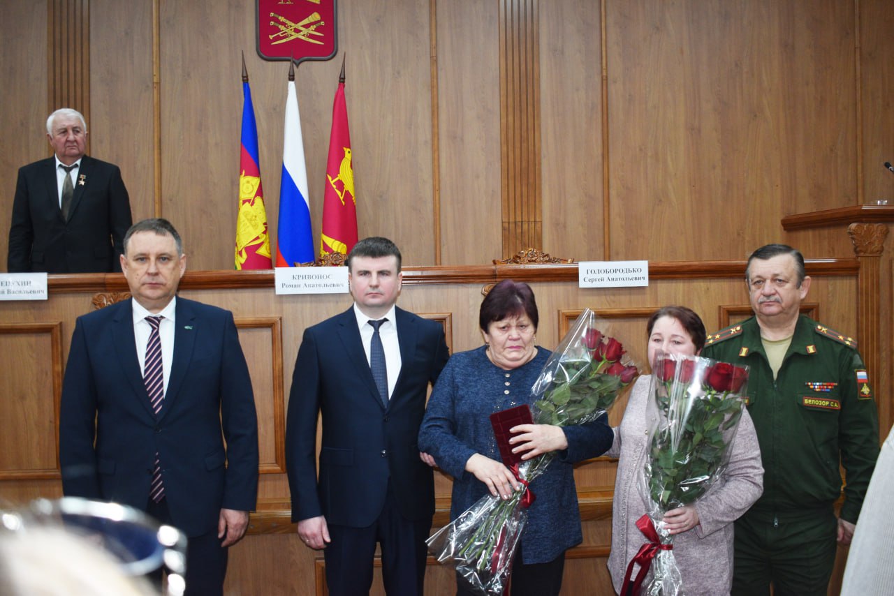 Мероприятие продолжилось церемонией вручения государственных наград. Эту миссию выполнили руководитель Департамента ветеринарии края Роман Кривонос, глава района Сергей Голобородько, военный комиссар Кореновского и Выселковского районов Сергей Белозор. Ордена Мужества (посмертно) были вручены семьям погибших героев: - старшего лейтенанта Иралимова Виктора Алексеевича, - рядового Крыгина Владимира Александровича, - ефрейтора Лысак Никиты Сергеевича, - гвардии младшего сержанта Палиенко Сергея Валентиновича, - рядового Упырь Александра Юрьевича. Имена наших воинов останутся в истории района, вечная память защитникам Отечества!