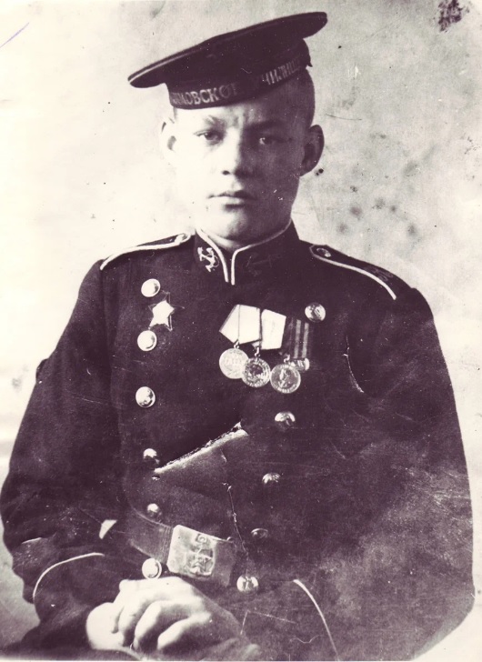А храброго юнгу направили на обучение в Нахимовское училище, где имеется его фото в парадной форме с орденом Красной Звезды и медалями «За боевые заслуги», «За оборону Кавказа» и «За победу над Германией».