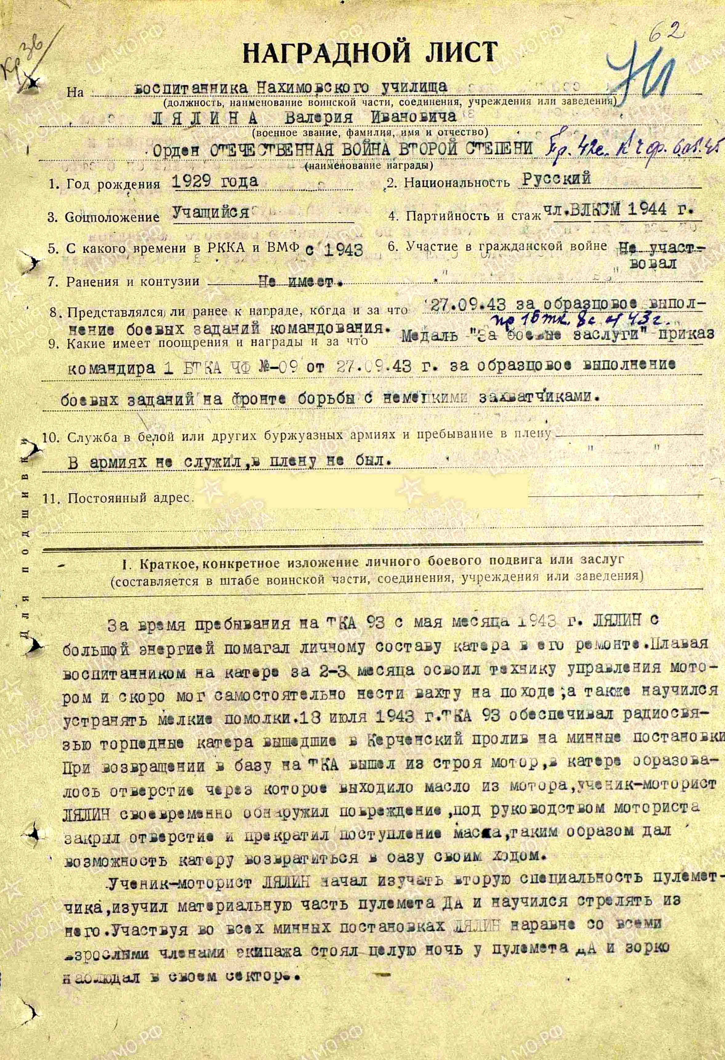 Эти успехи были особо отмечены командованием. Из наградного листа: «За время пребывания на ТКА 93 с мая месяца 1943 года Лялин с большой энергией помогал личному составу катера в его ремонте. Плавая воспитанником на катере, за 2-3 месяца освоил технику управления мотором и скоро мог самостоятельно нести вахту на походе, а также научился устранять мелкие поломки». (Приказ Командующего Черноморским Флотом №: 42с от 06.05.1945)