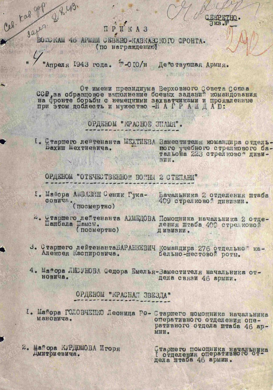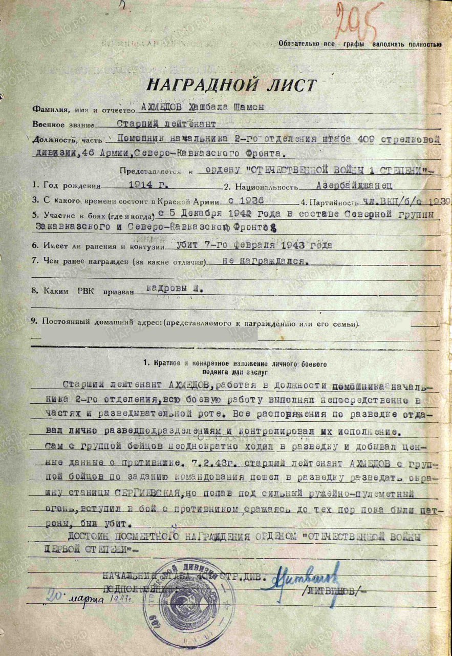 Точно такой же наградной лист оформлен и на старшего лейтенанта Ахмедова, помощника майора Айвазяна. Оба впоследствии награждены посмертно орденами Отечественной войны 2-й степени.
