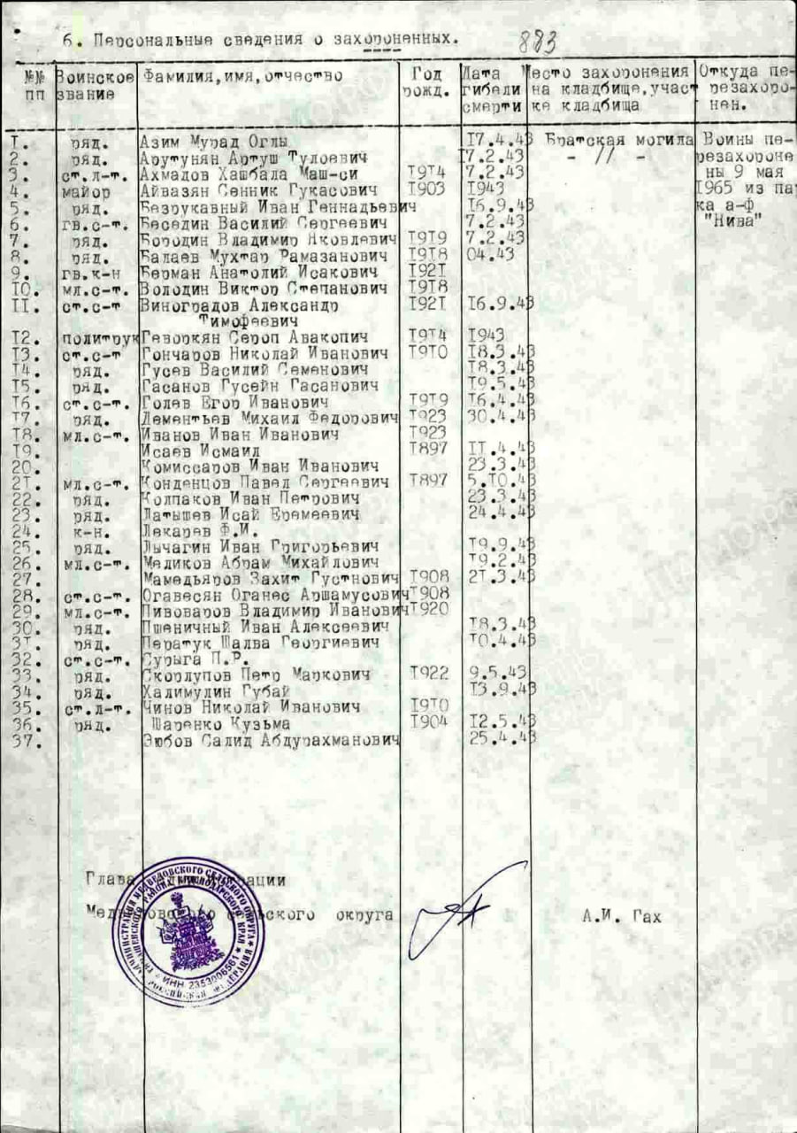 «Направившиеся для точного определения засевшей группы противника НО-2 (*начальник 2-го отдела штаба – авт.) майор АЙВАЗЯН, его помощник ст.л-нт МУХАМЕДОВ (*в других документах Ахмедов или Ахмадов – авт.) и адьютант КСД (*КСД- командир стрелковой дивизии – авт.) мл. л-нт ИВАНОВ были противником по всей вероятности захвачены в плен или убиты, в последующем найдены убитыми автоматными и пулеметными очередями».