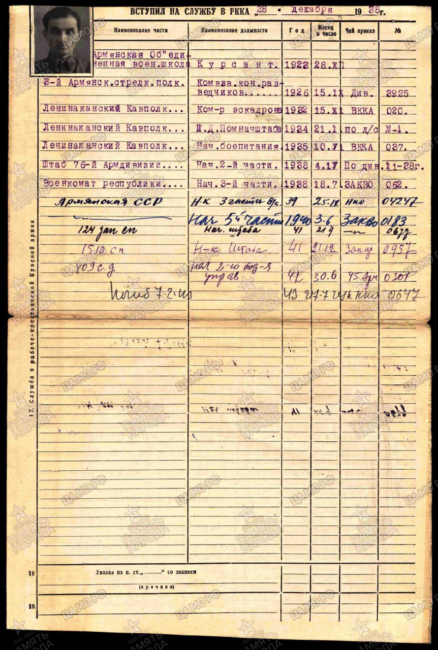 • с 1932 г. зачислен в Ленинаканский кавалерийский полк, прошел службу от командира эскадрона до помощника начальника штаба;