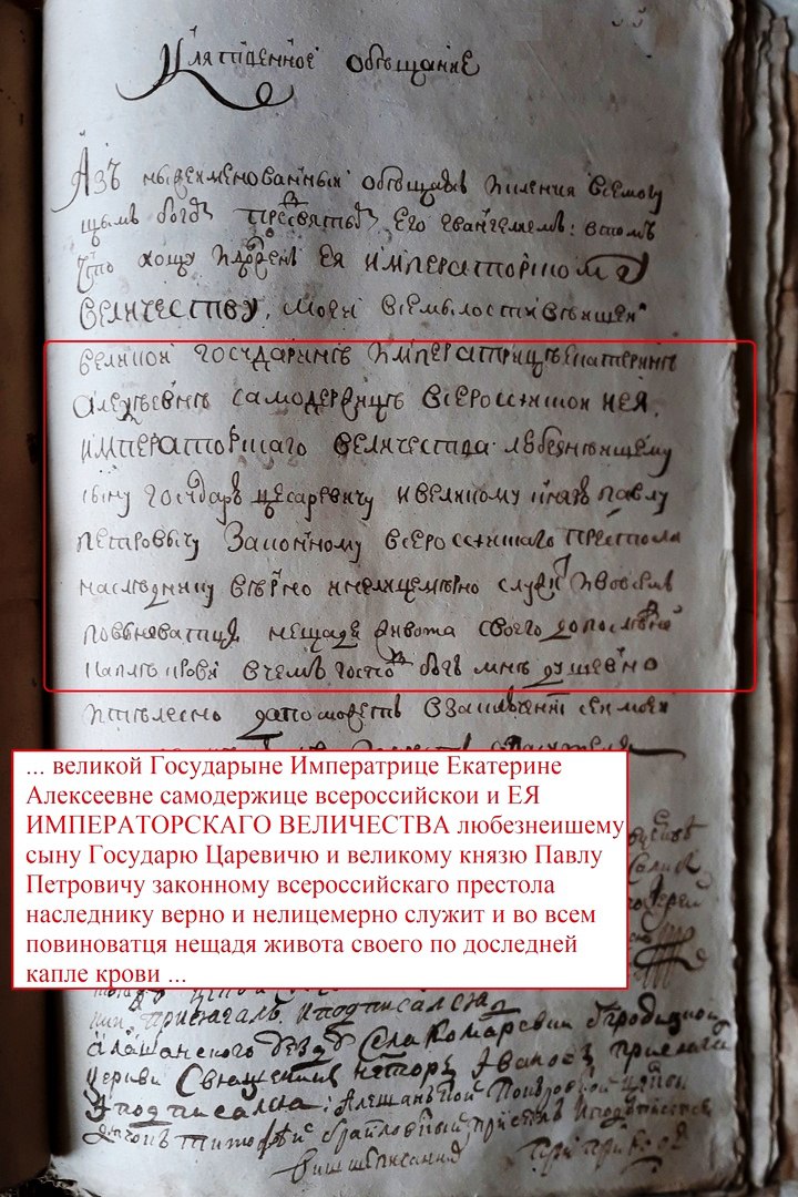 Текст присяги был следующим: «Аз нижеименованный обещаюсь и кленуся всемогущым Богом Пресвятым Его Еванегелием: в том что хощу и должен ЕЯ ИМПЕРАТОРСКОМУ ВЕЛИЧЕСТВУ, моеи всемилостивеишей великой Государыне Императрице Екатерине Алексеевне самодержице всероссийской и ЕЯ ИМПЕРАТОРСКАГО ВЕЛИЧЕСТВА любезнейшему сыну Государю Царевичю и великому князю Павлу Петровичу законному всероссийскаго престола наследнику верно и нелицемерно служит и во всем повиноватця нещадя живота своего по доследней капле крови в чем Господь Бог мне душевно и телесно дапоможет в заключении сеи моей клятвы целую слова и крест Спасителя моего, аминь».