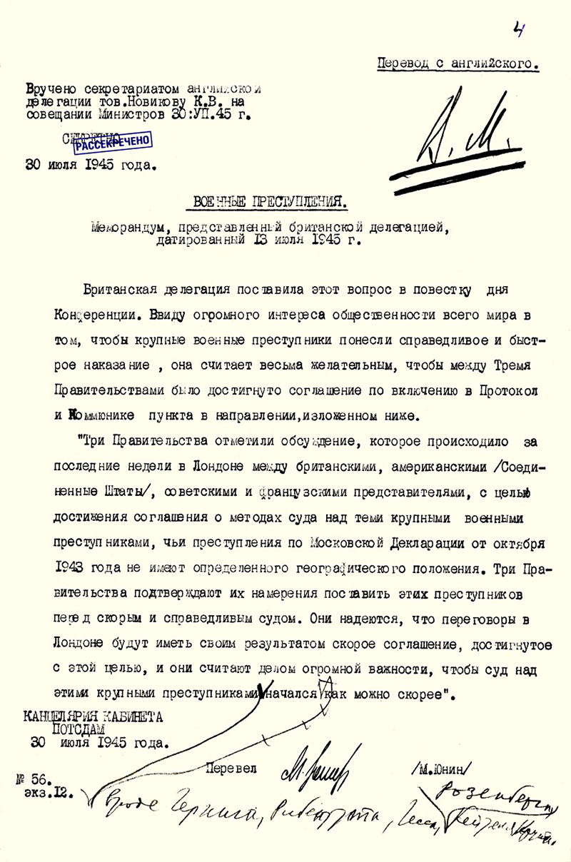 Наши делегаты получили жесткие инструкции из Кремля. Об этом нам поведал рассекреченный проект директивы «Советским представителям при переговорах в Лондоне по поводу соглашения о наказании главных военных преступников», направленный А.Я. Вышинским на подпись И.В. Сталину