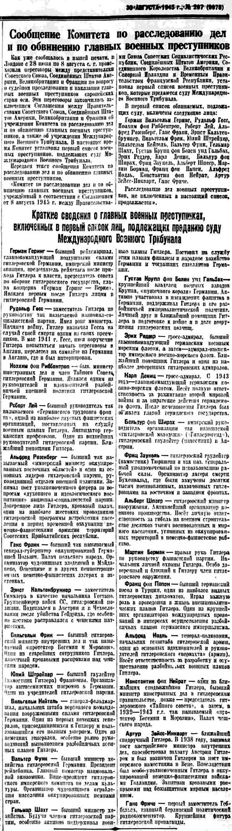 30 августа 1945г. был официально обнародован в печати общий список подсудимых Международного военного трибунала в Нюрнберге. После этого подготовка судебного процесса вступила в завершающую стадию.