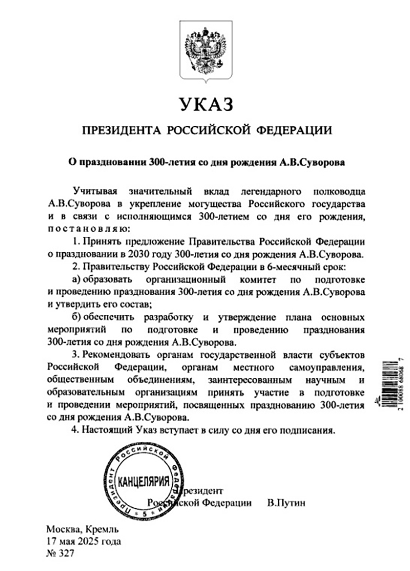 Последнюю точку в споре поставил Президент России Владимир Путин. Глава государства подписал Указ №327 от 17 мая 2025г «О праздновании 300-летия со дня рождения А.В.Суворова». Датой юбилея назначен 2030 год.