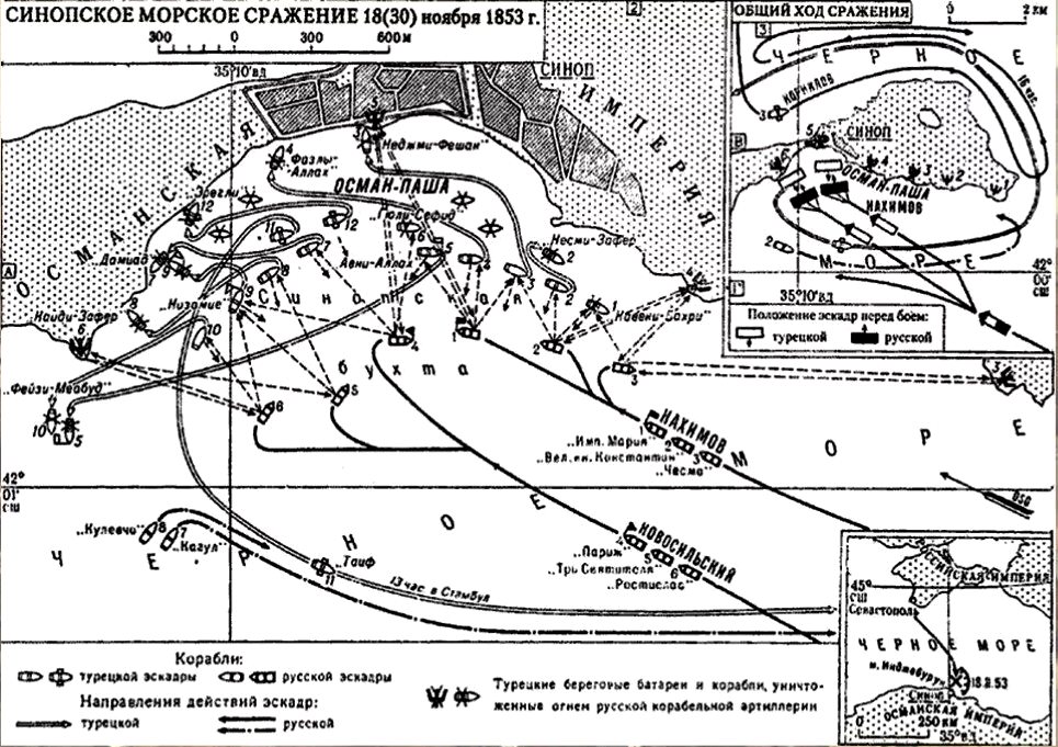 К середине ноября 1853 г. в Синопской бухте, где были в то время лучшие условия для ремонта судов, собрались три четверти турецкого парусного флота. Османские корабли могли в один переход оказаться в виду Феодосийской, вообще не защищенной, бухты. Еще более реальной представлялась опасность вторжения в Черное море находившихся в Босфоре англо-французских быстроходных и хорошо вооруженных пароходо-фрегатов. Они могли блокировать русскую Дунайскую армию с моря и нанести удар по Севастополю и Одессе. В этом никто ни в Петербурге, ни на Черноморском флоте не сомневался. Оставалось одно - нанести упреждающий удар. Нахимов провел операцию блестяще.