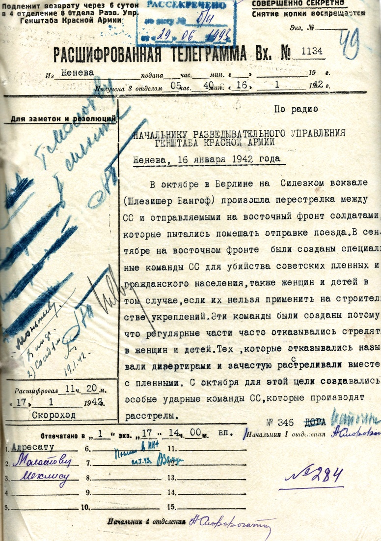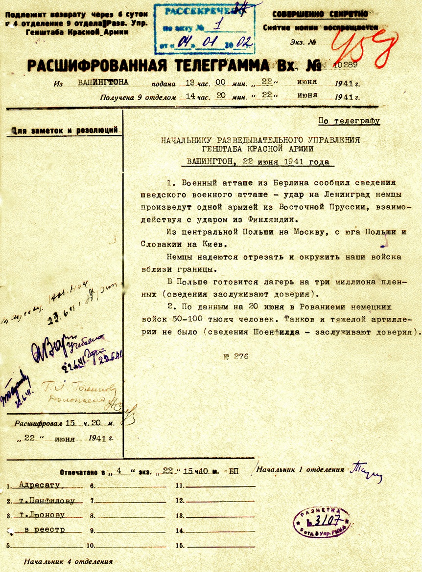Уже 22 июня 1941 года из Вашингтона в Разведуправление РККА направлена информация о том, что одновременно с нанесением ударов по Москве, Киеву и Ленинграду немцами в Польше ведется подготовка лагеря для приема трех миллионов пленных (ЦА МО РФ. Ф. 23. Оп. 24121. Д. 1. Л. 458).