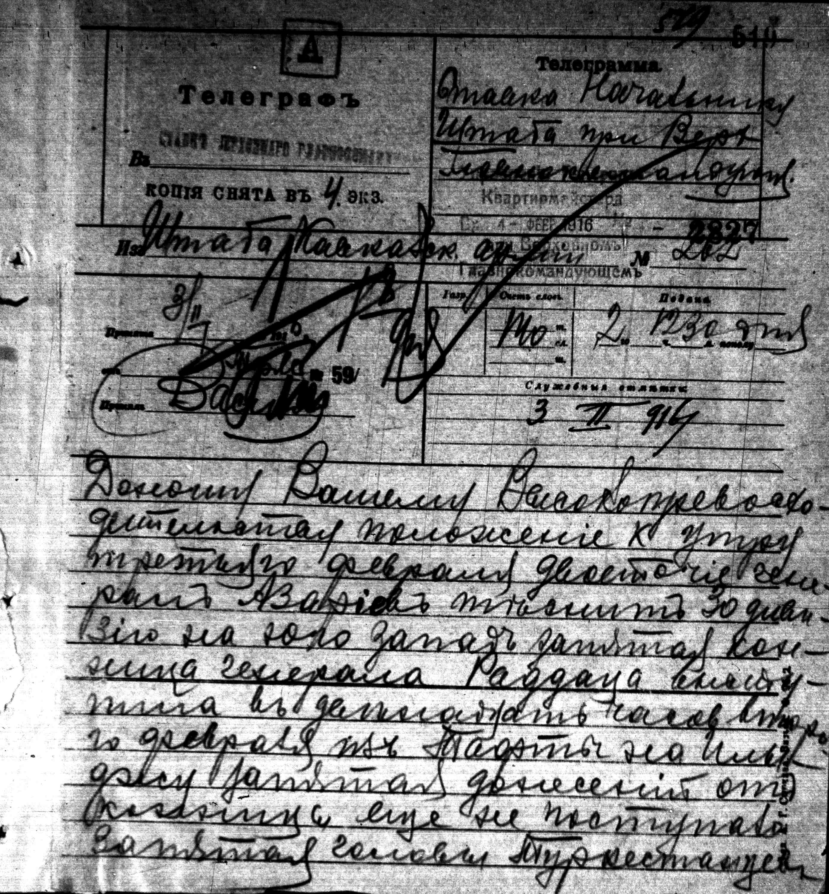 На пятый день операции, на рассвете 3 (16) февраля 1916 г., войска Кавказской армии подошли к Карским воротам города Эрзерума. Первым вошел в город с казачьей сотней есаул Медведев - старший адъютант штаба 1-го Кавказского корпуса.