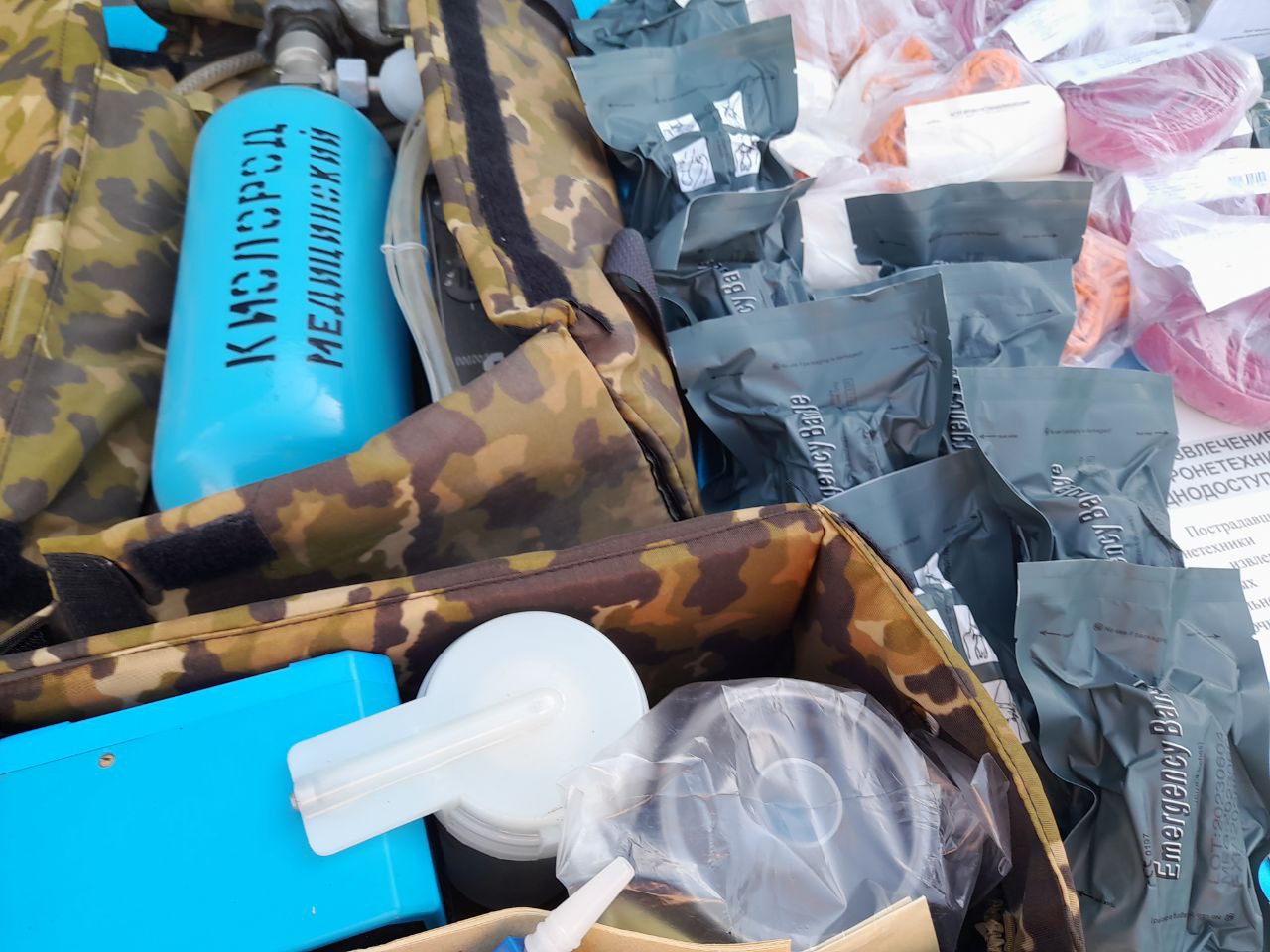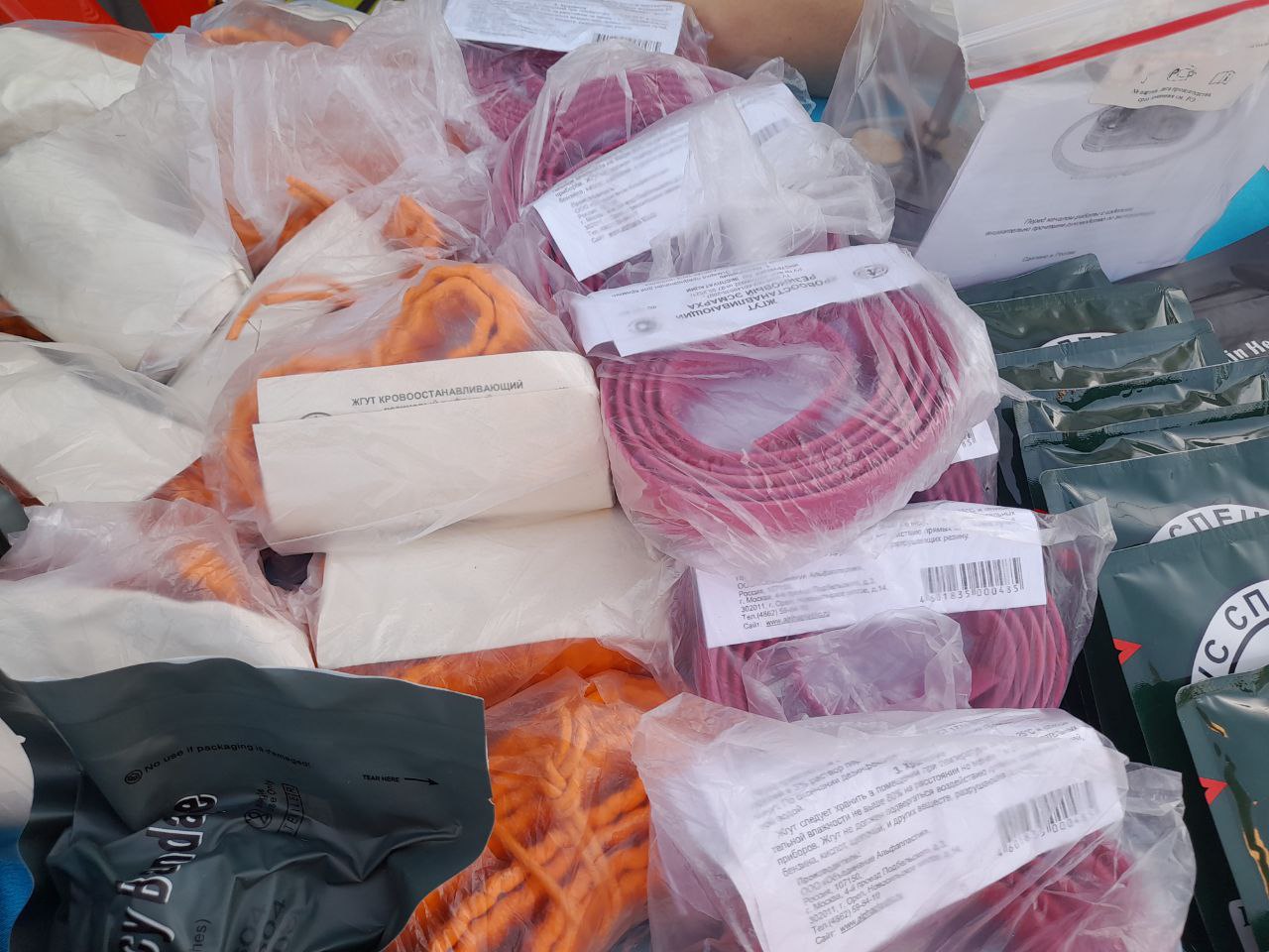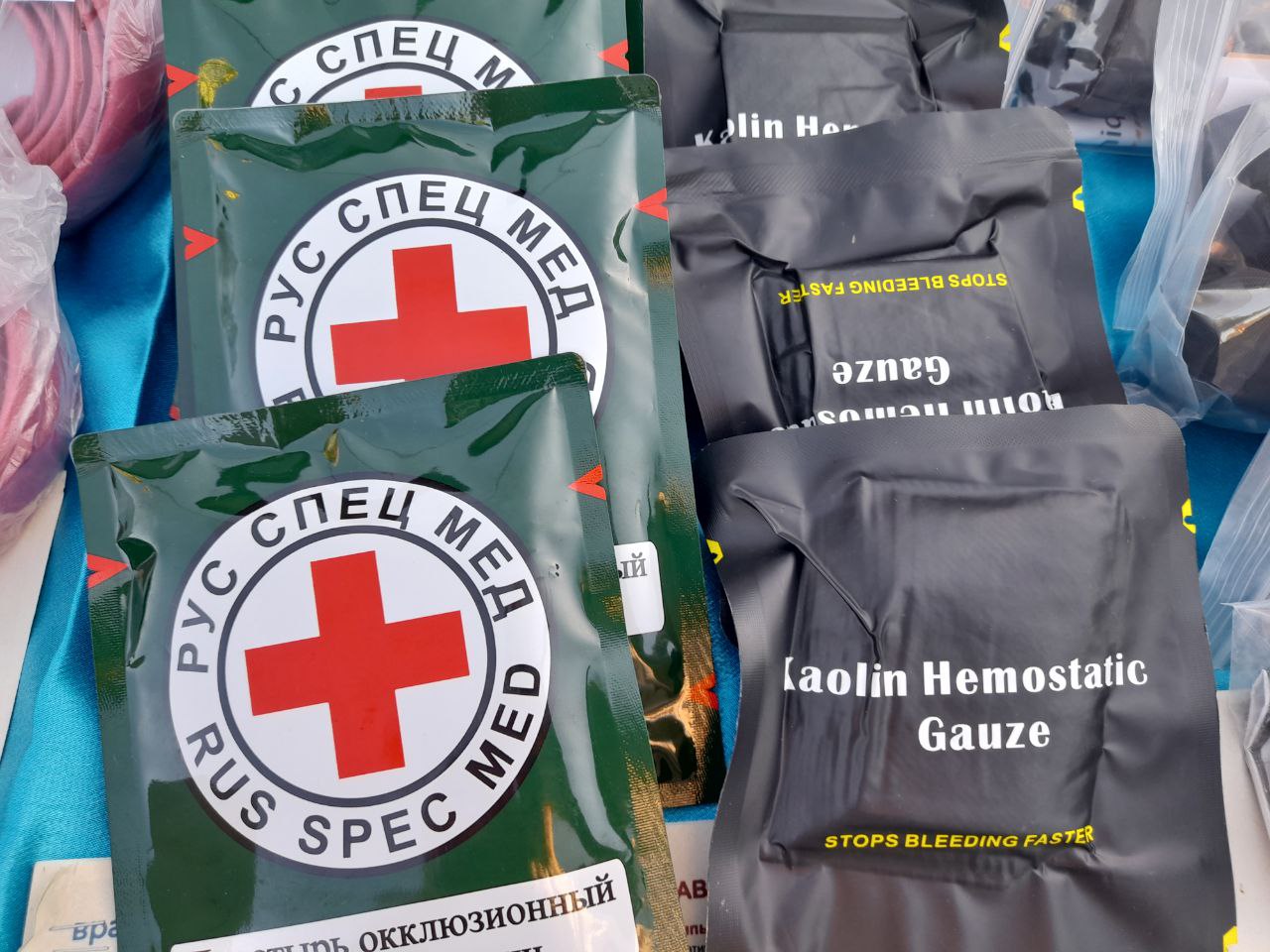 Здесь можно было увидеть все необходимое для спасения жизни военнослужащих: турникеты, ИПП, аптечки, в которых есть все, чтобы оказать первую помощь раненому бойцу, сухие души и многое другое.