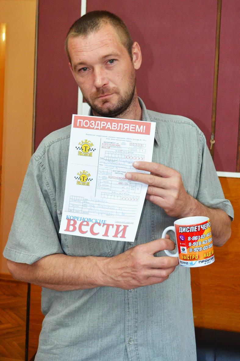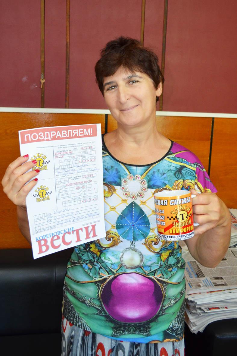 На днях в редакции газеты «Кореновские вести» мы вручили три очередные подписные квитанции на «районку». Награждала победителей Дарья Резник, диспетчер такси «Эконом».