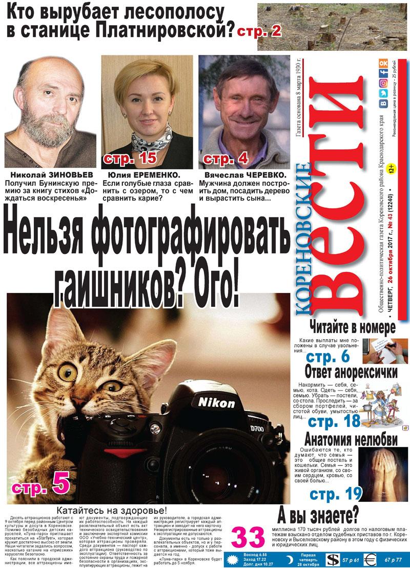 В новом номере свежеиспеченные четыре цветных страницы «Юнкора», резонанс на материал «Толстый VS тонкий» с шокирующим названием «Ответ анорексички», мнение главного редактора Нины Роженко о фильме «Нелюбовь», рассказ о водителе со стажем более 30 лет Вячеславе Черевко, ответы прокуратуры на вопросы кореновцев и многое другое.