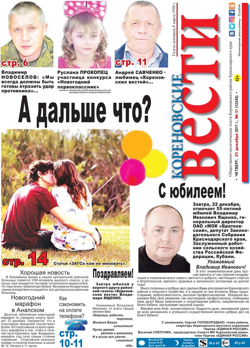 Также в свежем номере газеты — блог Андрея Бервино, продолжение путевых заметок Юрия Кондракова, обзор литературных новинок, спортивные репортажи, новости района, акция «Пристегнись, Россия!», любимицы «Кореновских вестей».