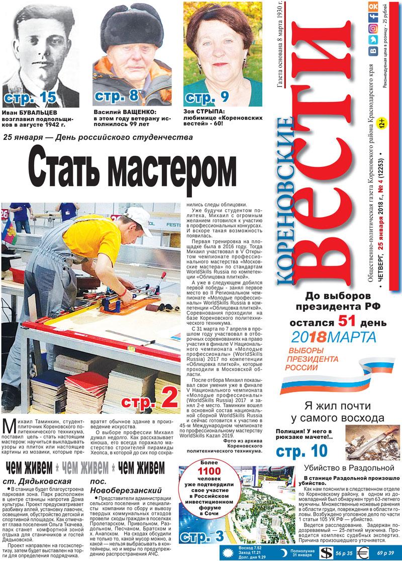 25 января студенты отмечают праздник. На первой полосе нового номера «Кореновские вести» рассказывают о Михаиле Таминкине, студенте Кореновского политехнического техникума, который поставил цель — быть настоящим мастером и упорно к ней стремится.