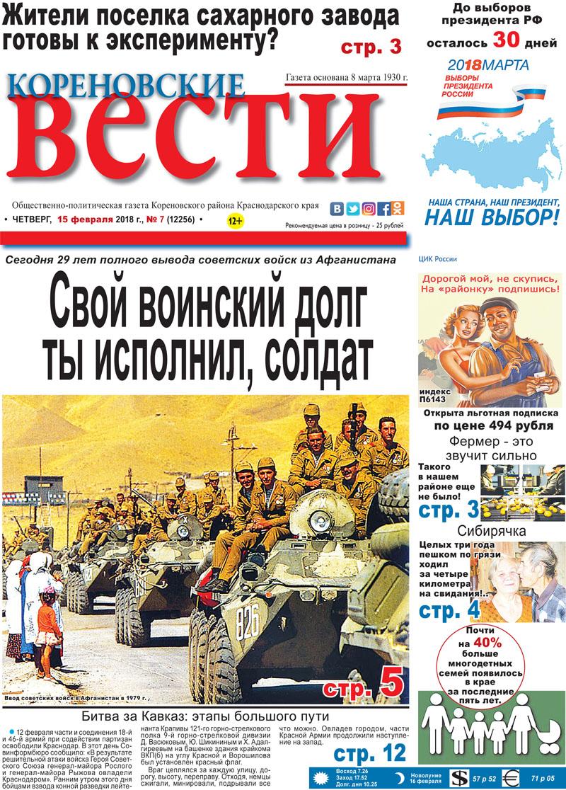 Также в свежем номере газета рассказывает о фермерах района, о доблести, о подвигах, о славе в рубрике «Перекличка поколений». Продолжают «Кореновские вести» разговор о поступке ульяновских курсантов. В социальных сетях свое мнение об этом выразили более 10 тысяч кореновцев.