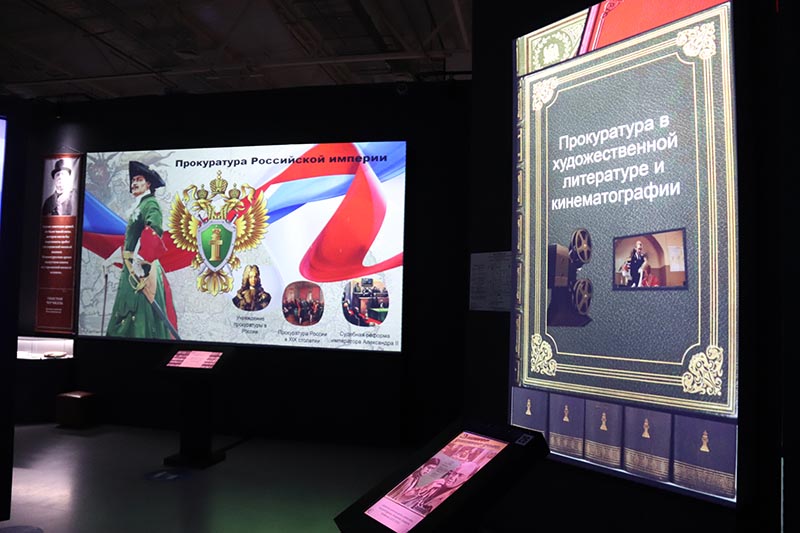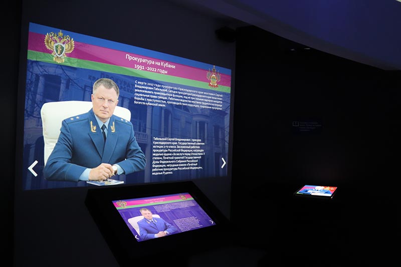 В экспозиции представлены два документальных фильма: один об истории Прокуратуры России, второй – о ветеранах прокурорской службы Краснодарского края.