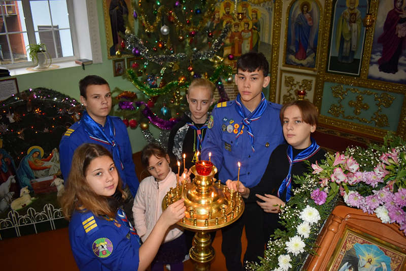 Малыши с интересом заглядывают в рождественский вертеп. Царит праздничная атмосфера приближающегося Рождества Христова. Ребята из Братства православных следопытов принимают активное участие в предпраздничных хлопотах с молитвами о здравии родных и близких в Новом году.