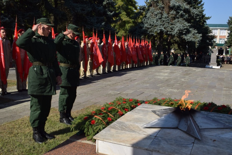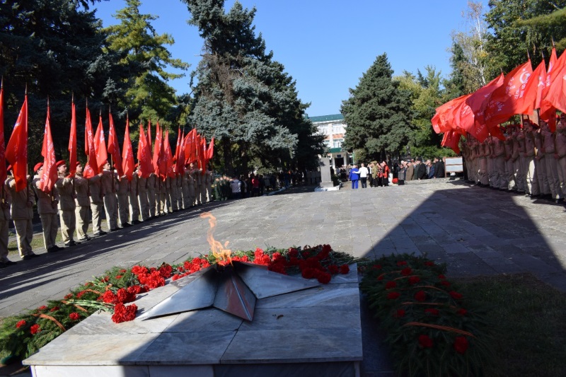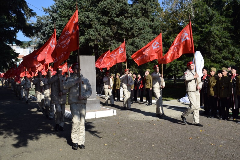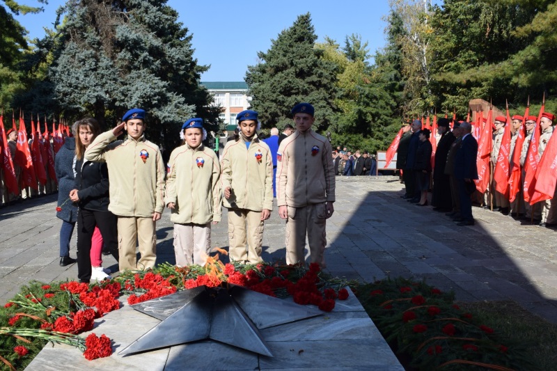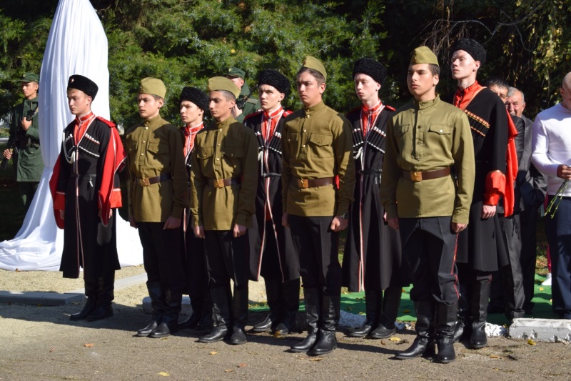 15 октября 2022 года: в станице Сергиевской многолюдно — здесь проходит торжественный митинг, посвященный открытию у станичного мемориала Славы и Вечного огня бюста майора, командира 2-го отделения 409-й стрелковой дивизии Сеника Айвазяна.