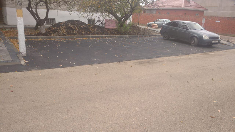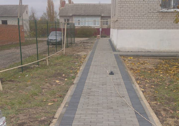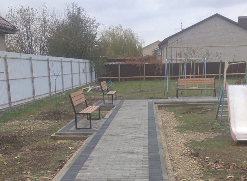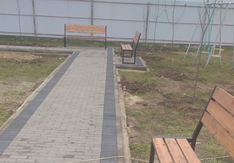 Уже уложена тротуарная плитка на дорожках, оборудована парковка, установлены лавочки и урны. Работы продолжаются, на очереди - установка детской игровой площадки.