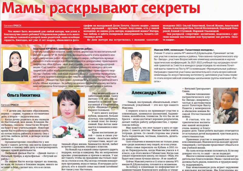 Что может быть желаннее для матери, чем успех и благополучие ее ребенка? Накануне Дня матери мы встретились с мамами "золотой" молодежи, чьи портреты украшают городскую доску почета - Ольгой Никитиной, Олесей Жешко, Анастасией Ивахно, Александрой Ким, Олесей Московцевой, Надеждой Назаровой, Еленой Ступиной, Мариной Ульяницкой и узнали из первых рук секреты воспитания замечательных детей.