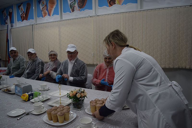Первым пунктом стала экскурсия по КМКК. Наверное, нет ни одного человека, кто бы не мечтал в детстве побывать на шоколадной фабрике или фабрике мороженого, чтобы своими глазами увидеть, как делается любимое лакомство детей и взрослых. И вот эта мечта сбылась — надев защитные халаты и шапочки, продезинфицировав руки в специальном дезинфекторе, гости попали в «святая святых» - ООО «Фабрику настоящего мороженого».