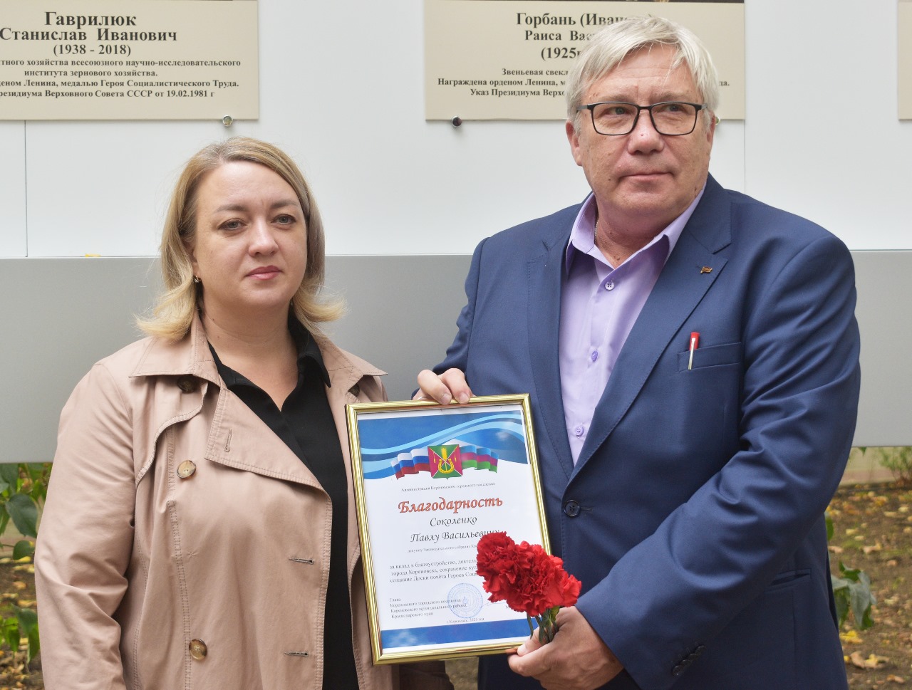 Благодарности главы Кореновского г/п вручили депутату ЗСК Павлу Васильевичу Соколенко (принял помощник депутата Э. Г. Ворлашкин), индивидуальному предпринимателю Сергею Викторовичу Лысинскому, члену Общественного Совета по вопросам местного самоуправления, инициатору создания доски почёта Героям Социалистического Труда Виктору Сергеевичу Попову.