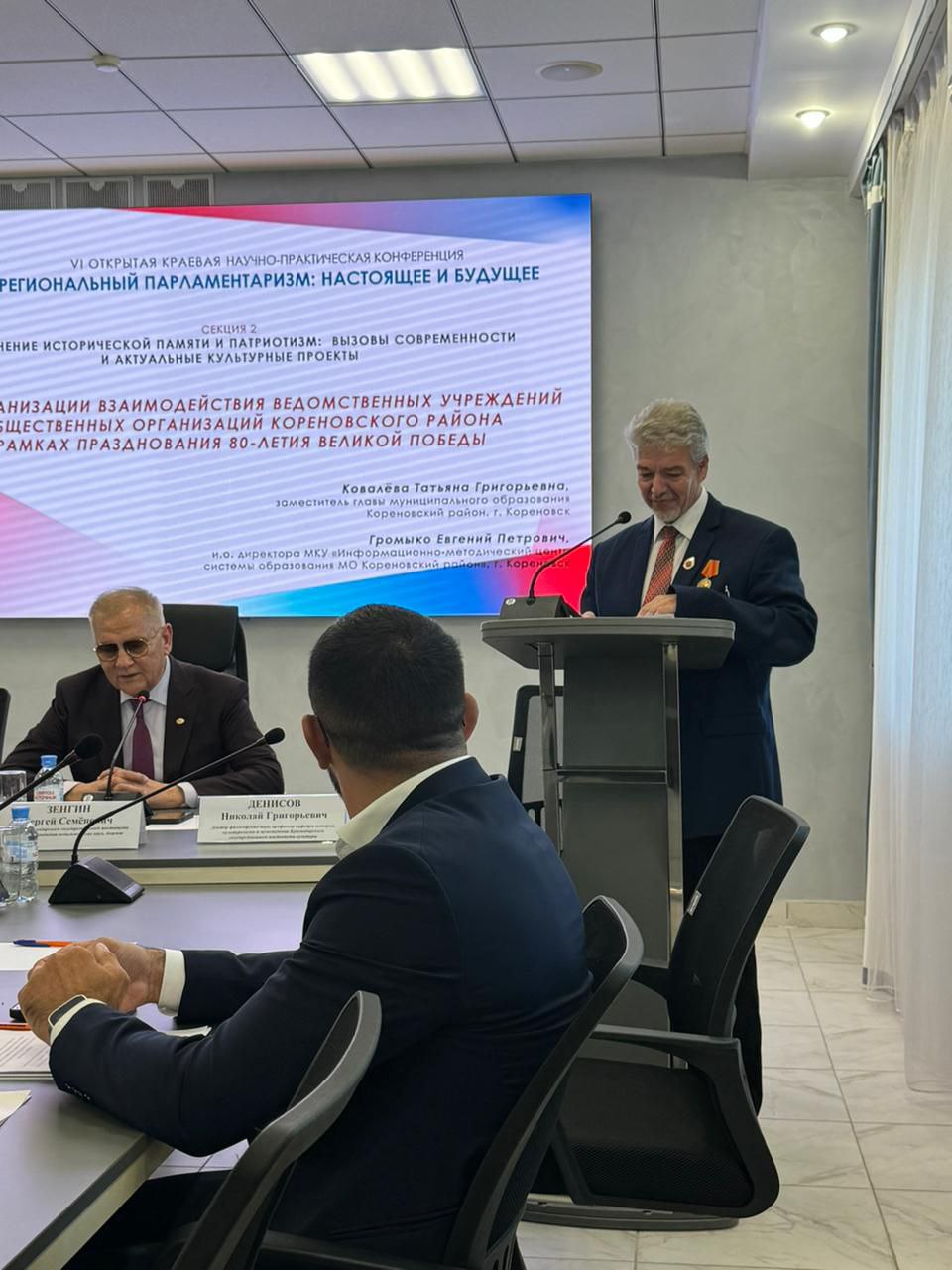 Одной из ключевых тем обсуждения стал юбилей Победы советского народа в Великой Отечественной войне. От нашего района на конференции выступил исполняющий обязанности директора МКУ «Информационно-методический центр» Евгений Громыко с докладом «Опыт организации взаимодействия ведомственных учреждений и общественных организаций Кореновского района в рамках празднования 80-летия Великой Победы», в котором осветил различные аспекты деятельности наших учреждений культуры, образования и органов власти на муниципальном уровне.