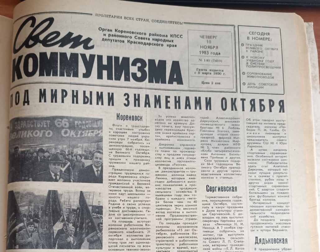 Так назывался репортаж первой страницы газеты «Свет коммунизма» за 10 ноября 1983 года. На снимках кореновцы — участники демонстрации, посвященной 66-летней годовщине Великого Октября.