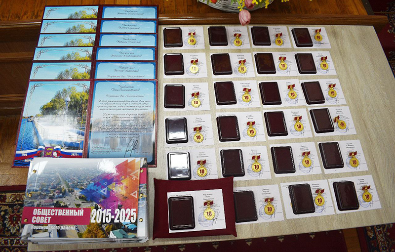 Активистам вручили юбилейные медали «10 лет Общественному Совету Кореновского района». Их получили члены Общественного Совета: Нина Николаевна Берлизова, Татьяна Вениаминовна Бойко, Николай Александрович Вергун, Юрий Николаевич Винник, Инга Юрьевна Геращенко, Наталья Павловна Григорьева, Сергей Евгеньевич Давыдов, Ольга Александровна Дузенко, Владимир Ильич Ежак, Александр Иванович Жаботинский, Светлана Петровна Живалева, Людмила Анатольевна Заветная, Наталья Анатольевна Касихина, Александр Федорович Леошко, Борис Борисович Овсяников, Виктор Сергеевич Попов, Ирина Ивановна Сергиенко, Виктор Юрьевич Симоненко, Инна Александровна Снитка, Александр Викторович Тарасов, Виктор Тихонович Фомичев, Валентина Андреевна Халина, Татьяна Владимировна Шагай.