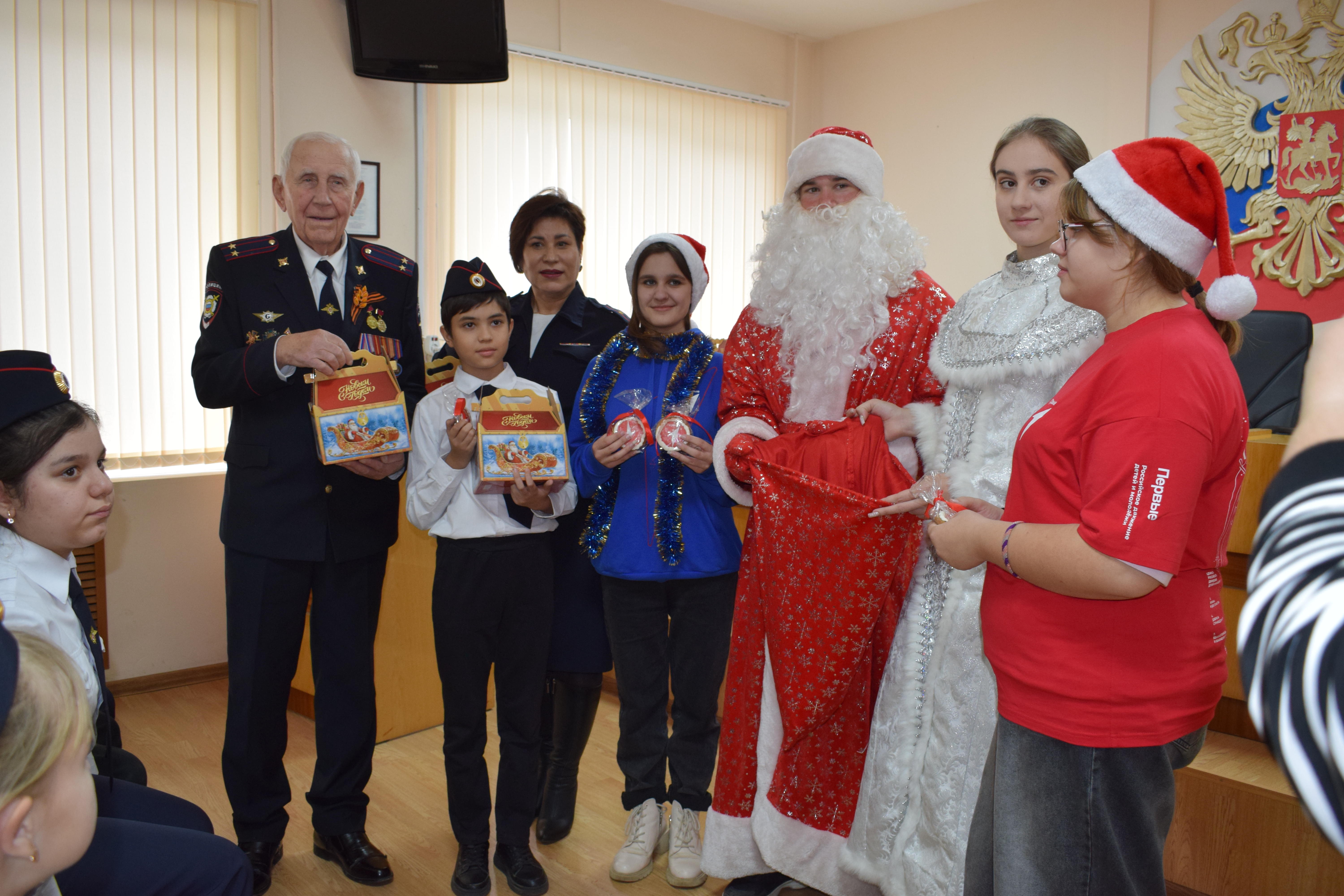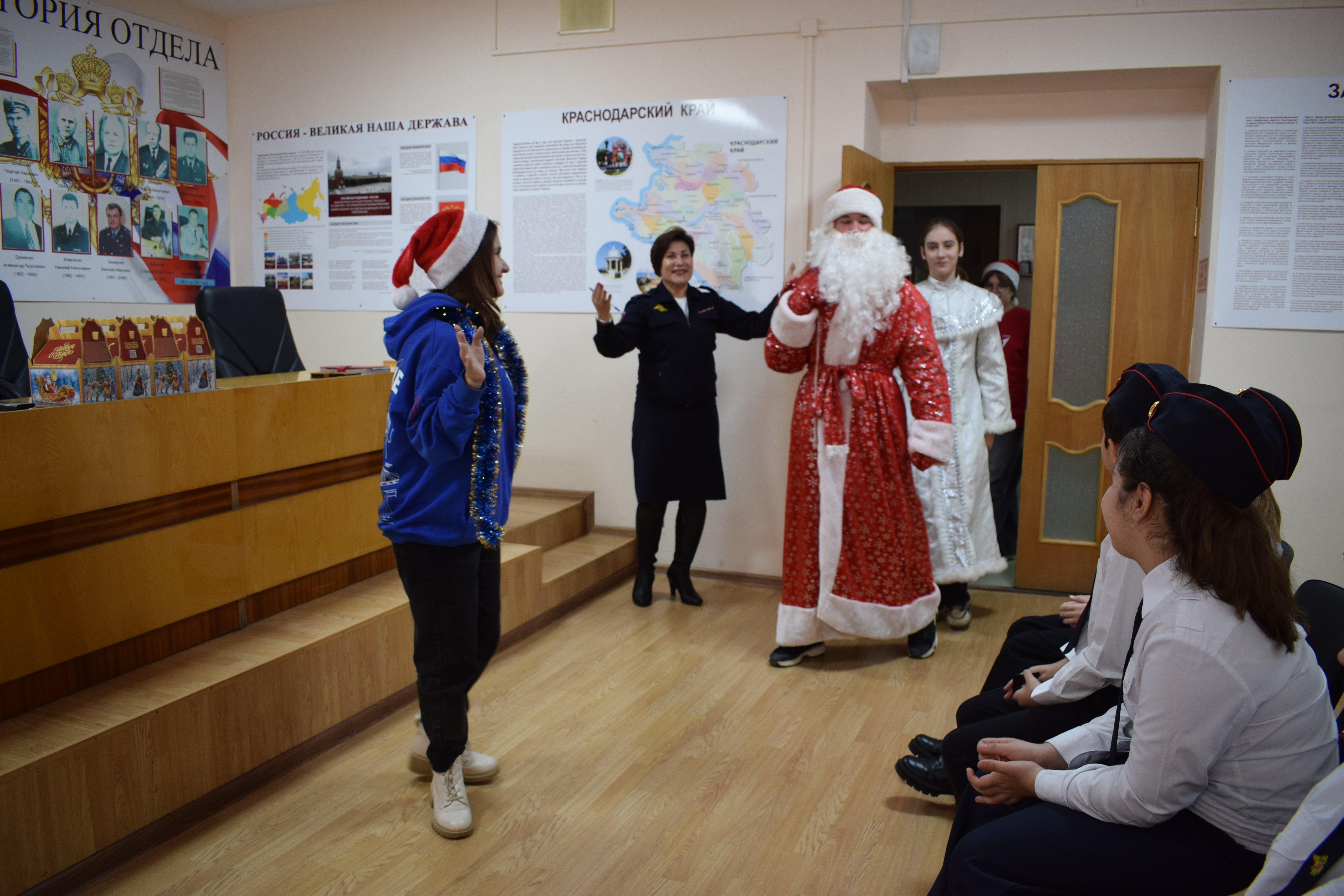 Учащиеся 4-Б и 6-А классов городской школы № 2 имени Героя Советского Союза Г.Н.Зеленского вместе с классными руководителями — директором школы Светланой Янгиевой и заместителем директора по воспитательной работе Натальей Ходаковской — не только узнали важную правовую информацию от председателя Совета ветеранов Отдела Николая Борщева, ВРИО заместителя начальника ОПДН УУП — начальника ОПДН МВД России по Кореновскому району майора полиции Елены Тарасовой и юрисконсульта Отдела капитана внутренней службы Нины Голушко, но и прямо в актовом зале гости встретили Деда Мороза и Снегурочку!