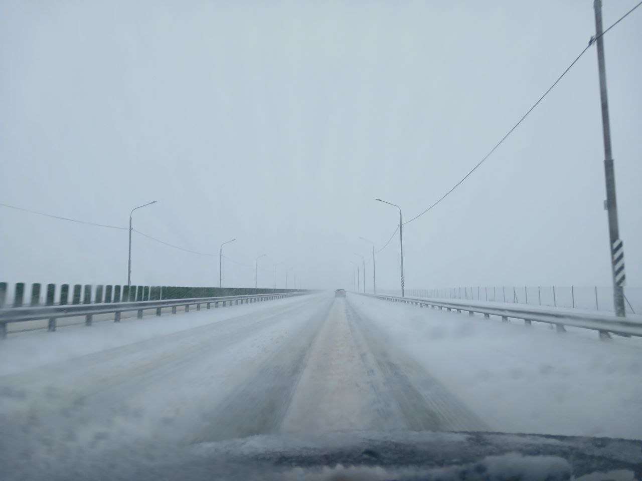 На трассе местами несколько раз попадались те, кто останавливал машины и очищал лобовое стекло. Кстати, надо и по скорости быть готовому к такому сценарию: впереди идущая машина вдруг начинает замедляться и медленно сходит к краю дороги. Так как мы все едем по наезженной колее, то уйти вправо к отбойнику быстро не получится: за пределами колеи снеговая масса, хоть и небольшая, но если попытаться сделать остановку на скорости, то может крутануть. Вот поэтому водители делают этот маневр медленно и плавно. Конечно, по правилам надо делать остановку на трассе в «карманах», но их по пути не так много, а если у водителя проблема с видимостью на лобовом стекле, то, конечно, он остановит машину там, где его застала беда.