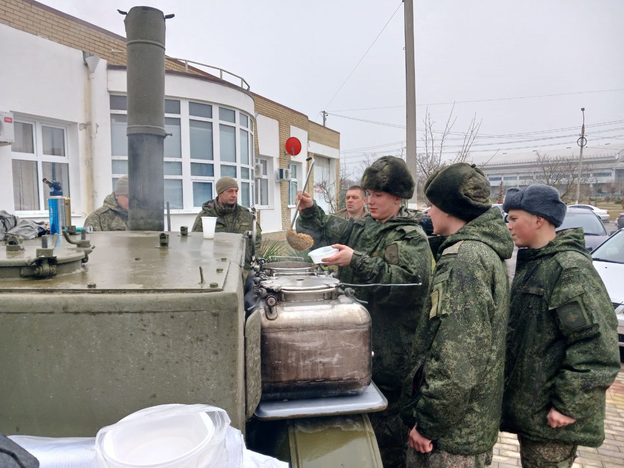 Военнослужащие 47 бригады роты материально-технического обеспечения, ответственные за раздачу, встречают гостей улыбками и поздравлениями.