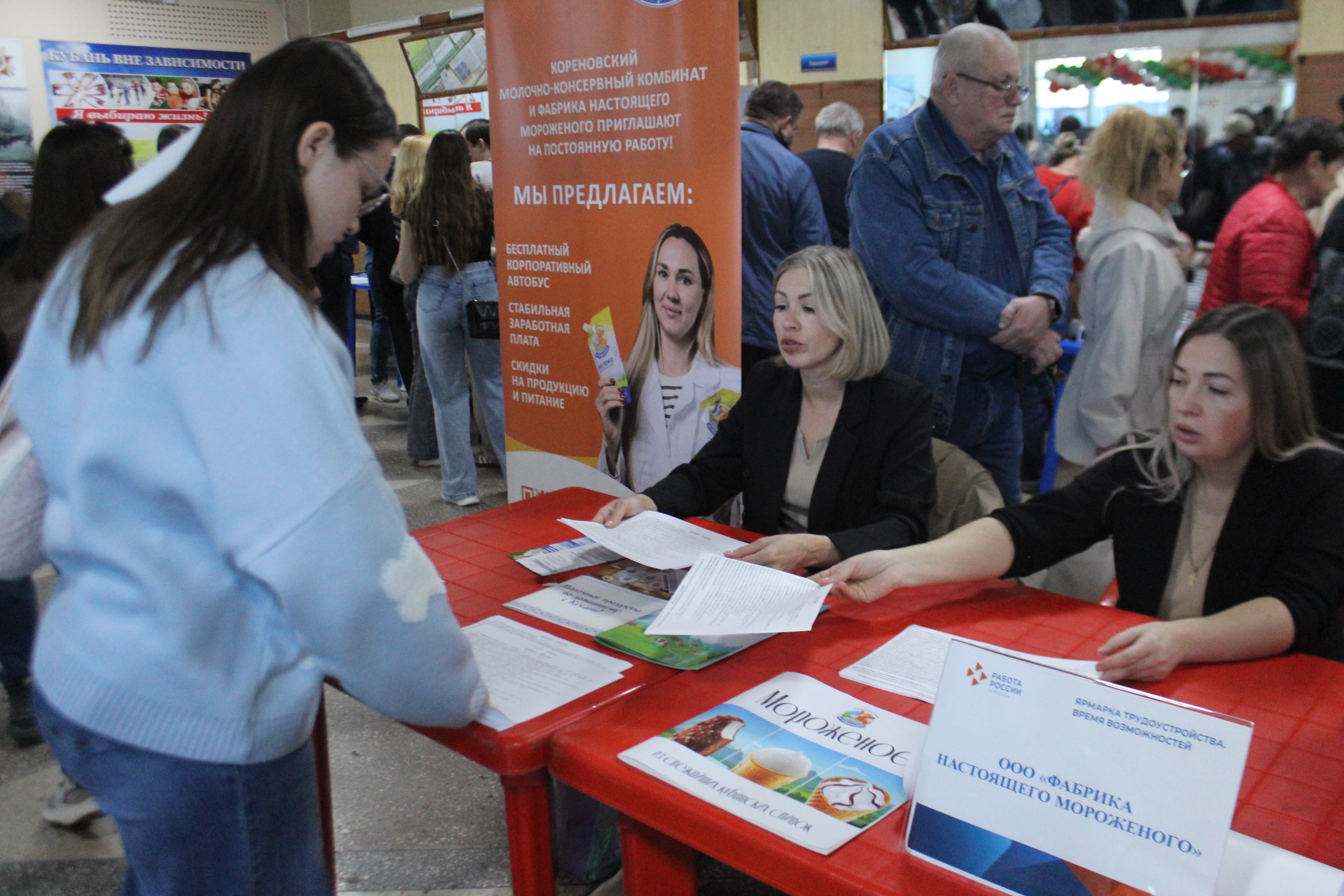 Вакансии представили 26 работодателей района, охватывающих ключевые отрасли: агропром (АО «Кореновсксахар», АО «МОК «Братковский», НПХ «Кореновское», ООО «БДМ АГРО», ООО «Золотой колос»), ЖКХ и благоустройство (МУП «ЖКХ», «Центр озеленения», «Уютный город»), социальную сферу и здравоохранение (Кореновский КЦСОН, Кореновская ЦРБ,), культуру (Городской дом культуры №1 и Городской парк), спорт («Академия спорта», Спортивная школа, ГСДЦ), промышленность и транспорт (ЗАО «МКК» и «Фабрика настоящего мороженого», АО «Кореновское АТП»,), а также силовые и государственные структуры (Военный комиссариат, «Служба спасения», ОМВД России по Кореновскому району и Государственный фонд поддержки участников СВО «Защитники Отечества»). Также ждали кандидатов образовательные учреждения, Ветуправление, администрация района и другие организации.