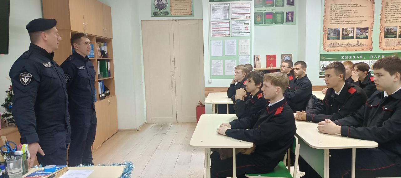 Инспектор ОГИБДД ОВД по Кореновскому району А.А.Бунчук проводит профилактическую беседу о безопасности на дорогах. Такие встречи - не просто формальность, а реальная забота о жизни и здоровье наших ребят. Знание и соблюдение ПДД — это дисциплина и ответственность, которые ценятся в казачьих традициях.