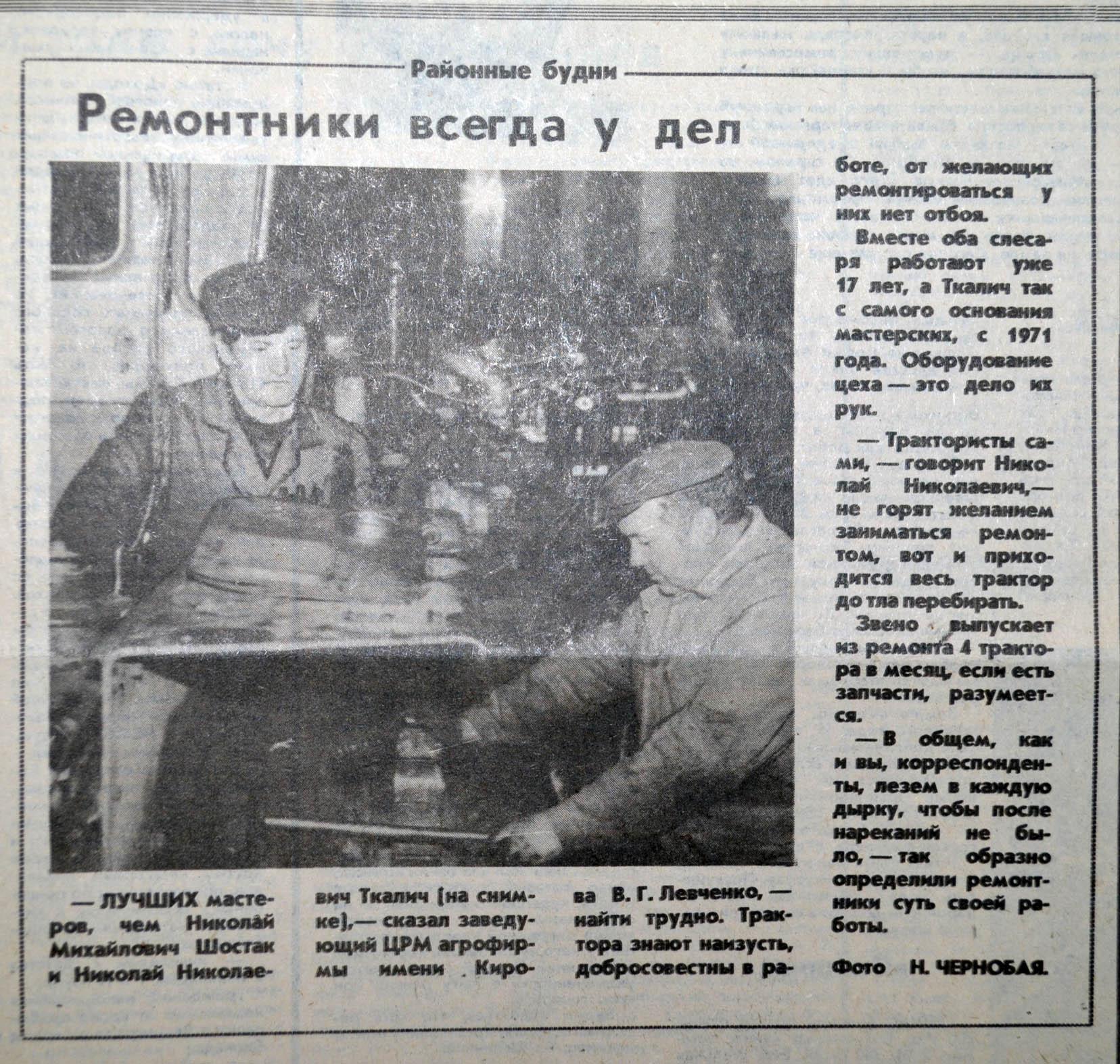 Лучших мастеров, чем Николай Шостак и Николай Ткалич (на снимке) найти трудно. И трактора знают наизусть, и в работе добросовестны. От желающих ремонтироваться у них - отбоя нет. О мастерах ремонтного дела агрофирмы имени Кирова писала "районка" 18 января 1992 года.