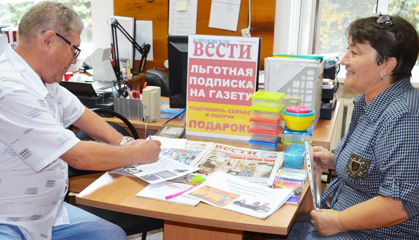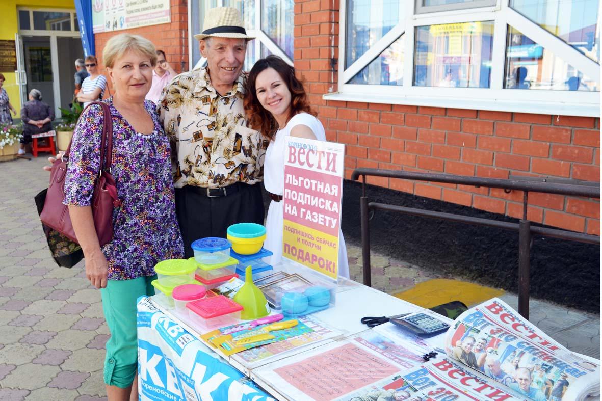 Сегодня у книжного магазина по улице Красной сотудники редакции подписывали всех желающих на газету «Кореновские вести» ПО НИЗКОЙ ЦЕНЕ, БЕЗ ОЧЕРЕДИ И ДАРИЛИ ЗА ЭТО ПОДАРОК!!! Если вы еще не успели выписать «КВ» на первое полугодие 2018 года за 494 рубля, то нужно поторопиться, ведь льготная подписка закончится вместе с летом. С 1 сентября цена на "районку" поднимется.
