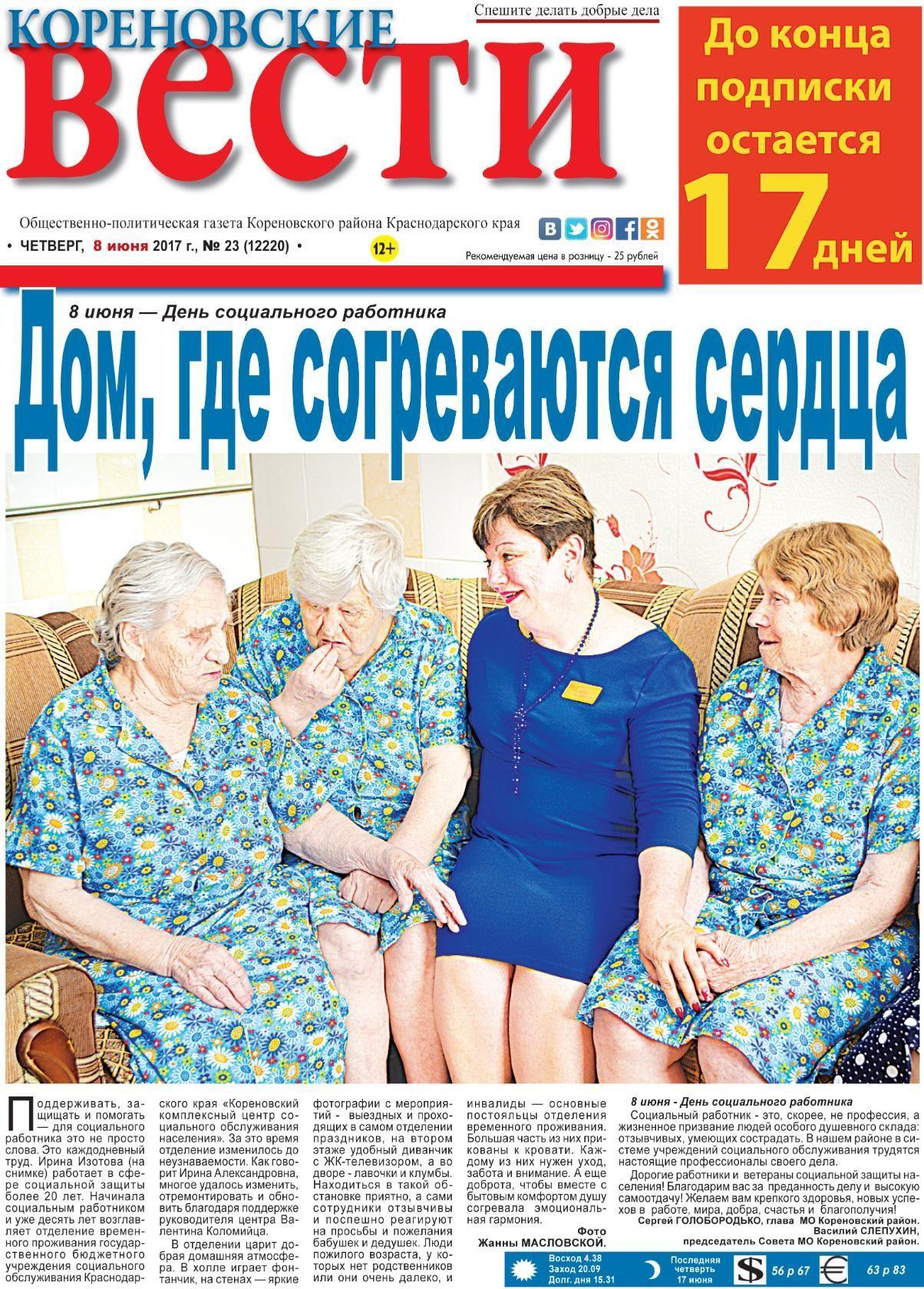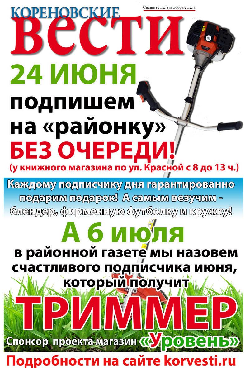 Друзья, приглашаем вас на финальный, итоговый день подписчика на районную газету "Кореновские вести"! Каждому, кто подпишется в этот день, мы подарим подарок! А среди всех подписчиков июня, кто выписал "районку" на второе полугодие 2017 года мы разыграем супер-приз - замечательный триммер от магазина "Уровень"! Если вы подписались на "КВ" в другом месяце, то не стоит отчаиваться! Подпишите на любимую газету своих родителей, сестру или брата, кумовьев или соседей и примите участие в июньском розыгрыше триммера! Имя победителя мы назовем в первом июльском номере нашей газеты. Успейте подписаться!