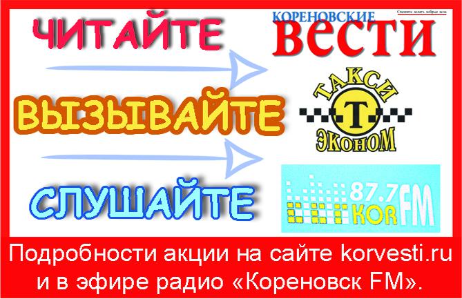 Вот уже несколько месяцев такси «Эконом» проводит акцию при информационной поддержке радио «Кореновск-ФМ» и районной газеты «Кореновские вести».