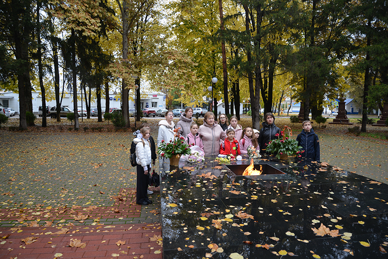 Участники экскурсии посетили Мемориальный комплекс: памятник неизвестному солдату и аллею Славы на братских могилах советских воинов, погибших в боях с фашистскими захватчиками в 1942 году. Здесь захоронены партизаны и воины Красной армии -офицеры, сержанты и солдаты. Отдавая дань памяти воинам-освободителям, юнкоры возложили цветы к Вечному огню.